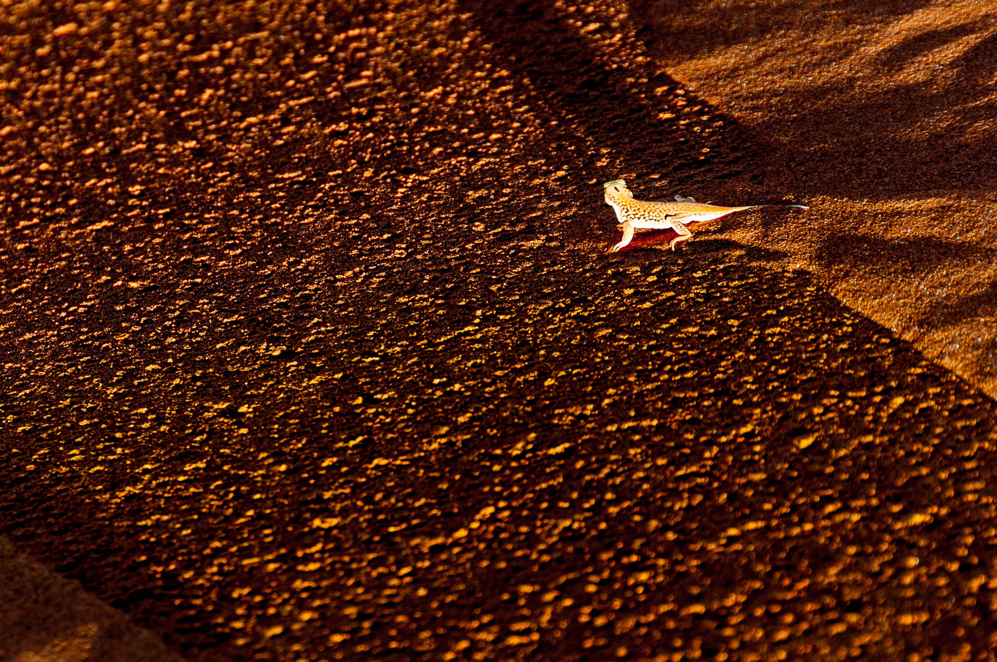 Hier zeigt die Eidechse eine interessante Art, auf dem heißen Sandboden verharren zu können: sie steht einfach abwechselnd auf zwei Füßen und zwar entweder vorne links und hinten rechts oder vice versa. Wechselt man zwischen den letzten beiden Fotos dieser kurzen Serie in der Vollansicht schnell hin und her (z.B. mit den entsprechenden Pfeiltasten der Tastatur), dann versteht man diese recht lustig anzuschauende Methode etwas besser.