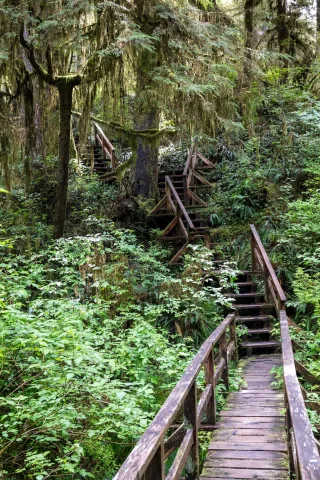 Hier wachsen gewaltige, jahrhundertealte Rotzedern und Sitka-Fichten, umgeben von dickem Moos, Farnen und baumhohen Sträuchern. Das Grün leuchtet in allen Nuancen – besonders nach Regen oder bei diffusem Licht. Über umgestürzte Baumriesen, die als natürliche Brücken dienen, geht es über Abgründe – mal über hölzerne Treppen, mal auf federnden Plankenwegen. HDR-Aufnahmen bieten sich an, um das geheimnisvolle Licht einzufangen, das durch das dichte Blätterdach fällt. Mit den passenden Presets lässt sich der Wald in seiner mystischen Aura sichtbar machen.