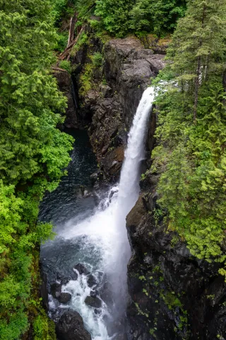 Ein besonderes Highlight ist der Elk-Wasserfall im Elk Falls Provincial Park. Der Weg dorthin führt durch ursprüngliche Wälder, vorbei an Douglasienriesen und über gepflegte Holzstege. Am Ende wartet ein architektonisches Meisterwerk: eine 64 Meter hohe Hängebrücke, die sich in luftiger Höhe über die Schlucht spannt. Mit einer Länge von 60 Metern ist sie die höchste Fußgängerbrücke auf Vancouver Island und wurde 2015 eröffnet. Von hier aus blickt man direkt auf die rund 25 Meter tief stürzenden Wassermassen des Elk Falls – ein atemberaubendes Naturschauspiel, das donnernd in die Tiefe rauscht.