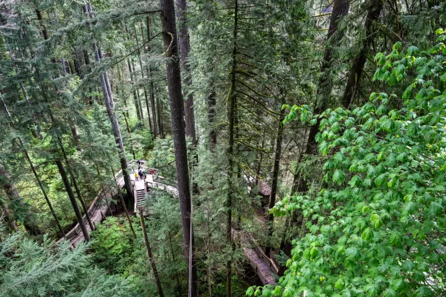 Nur wenige Kilometer weiter nördlich, bereits inmitten uralter Regenwälder, spannt sich die Capilano Suspension Bridge über eine 70 Meter tiefe Schlucht. Seit 1889 zieht sie Mutige in ihren Bann – heute ergänzt durch Baumwipfelpfade und den „Cliffwalk“, der an einer steilen Felswand entlangführt.