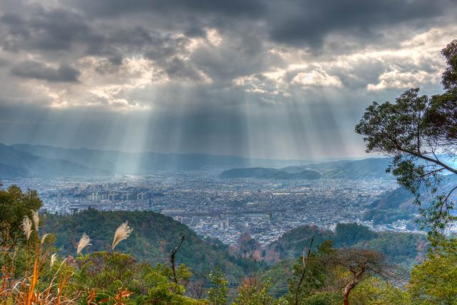 Das Wetter war ideal zum Fotografieren. Sonnenstrahlen durchbrachen den Blätterwald, tauchten die moosbewachsenen Steine in warmes Licht, und je höher wir kamen, desto weiter öffnete sich der Blick über Kyoto. Unten lag die Stadt unter einem Schleier aus Wolken, durchzogen von tausend Lichtstrahlen, die die Häuser wie in einem Traum erscheinen ließen.
