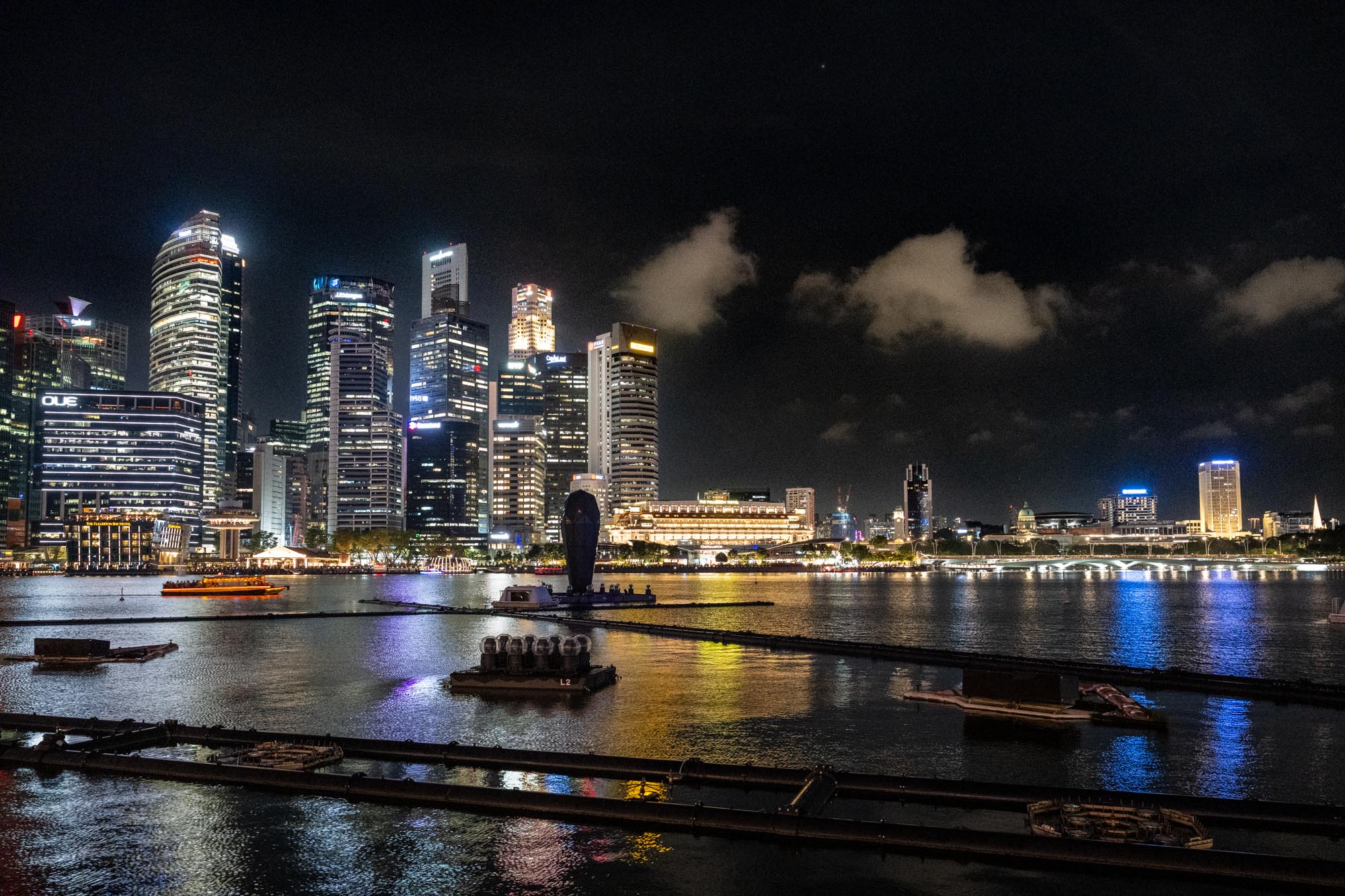 Diese Reise durch die nächtliche Wunderwelt begann mit Langzeitbelichtungen von einem der schönsten Aussichtspunkte der Stadt: Von der Marina Bay Sands aus zeigten sich die Skyline und das ruhige Wasser der Bay in vollendeter Harmonie. Die spiegelglatte Oberfläche verdoppelte das Lichtermeer und schuf eine fast surreale Szenerie.