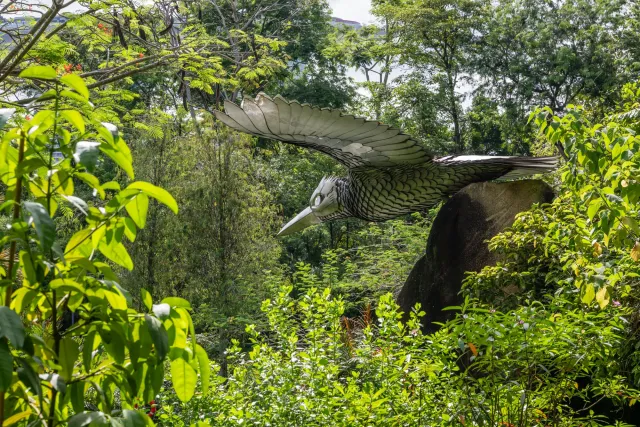 Die Wege durch den Park sind liebevoll gestaltet und führen direkt unter den Supertrees entlang. Mächtige Metallskulpturen, wie ein detailgetreu gearbeiteter Eisvogel, machen aufmerksam auf die artenreiche Tierwelt dieser Region.