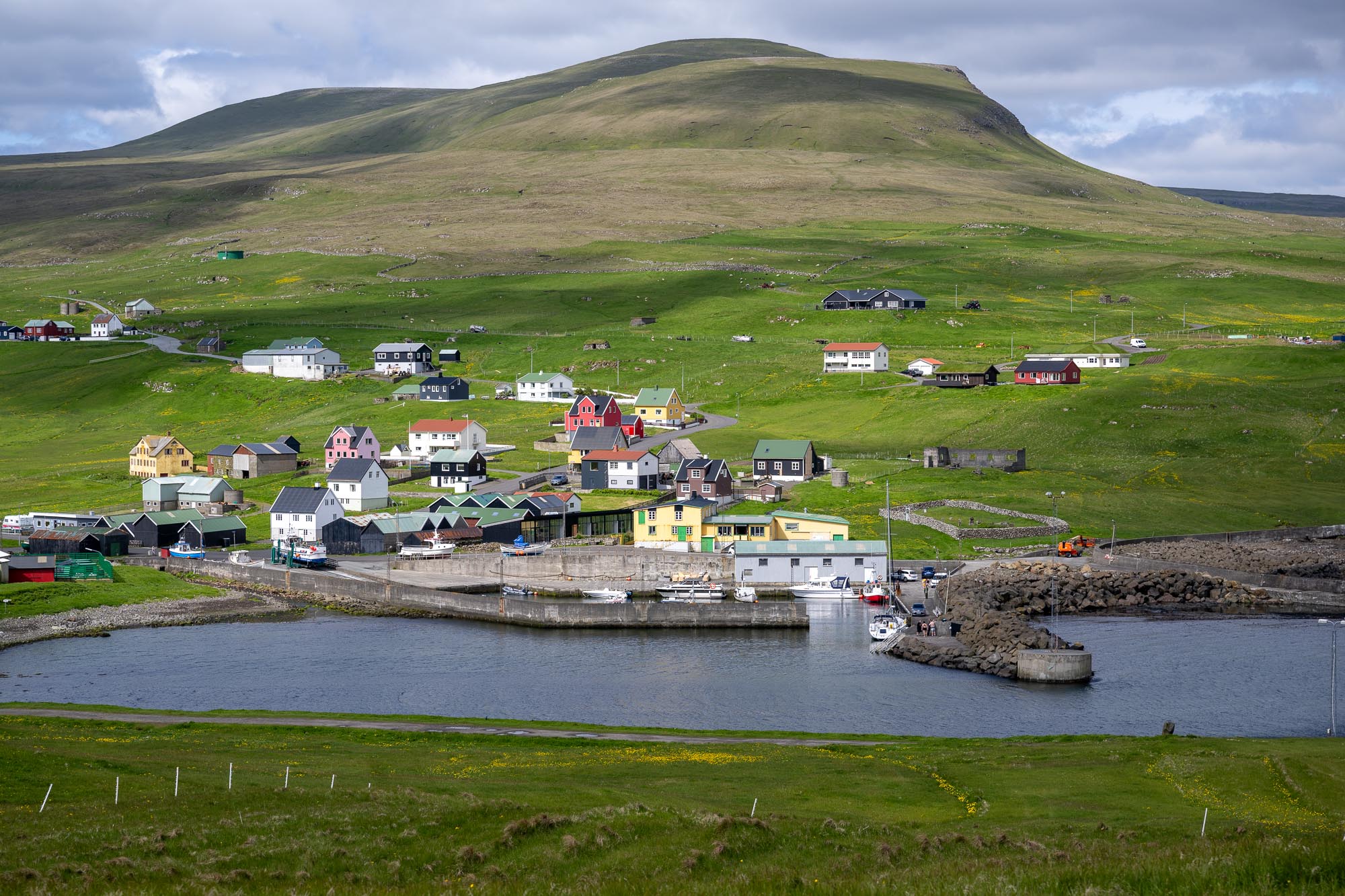 Weiter im Süden führen enge Straßen zu den Orten Húsavik und Dalur wo neben Butterblumen umsäumte Bäche das Landschaftsbild märchenhaft wirken lassen und weiter zu den Grasdachhäusern, für die die Färöer Inseln bekannt sind.