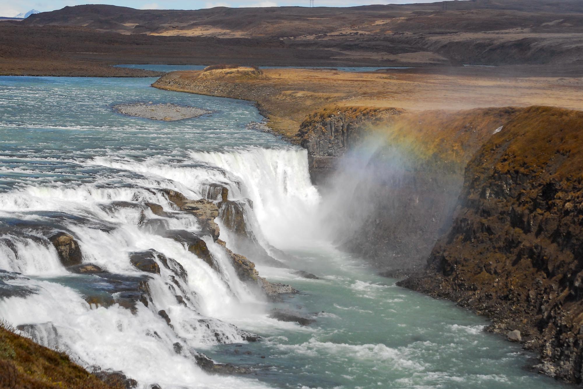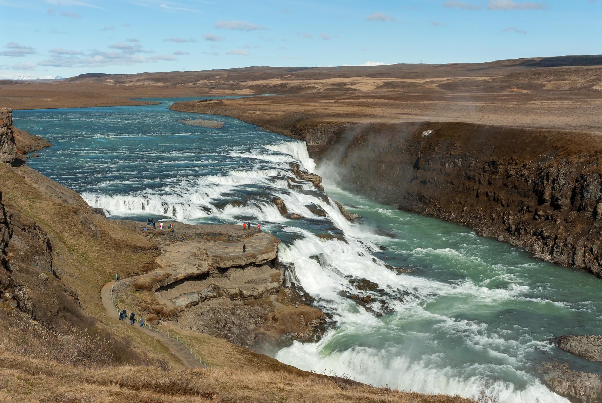 Wenn der Fluss Hvítá im Haukadalur über zwei Kaskaden in die Tiefe stürzt, hat er genug Energie gesammelt, um sich seinen Weg durch die anschließende Schlucht zu bahnen - ein Naturschauspiel, das seinesgleichen sucht. Seit der Eiszeit fräst sich der Fluss nach seinen beiden Kaskaden jedes Jahr rund 25 cm tiefer in den Fels und die 2,5 km lange Schlucht ist mittlerweile 70 Meter tief.