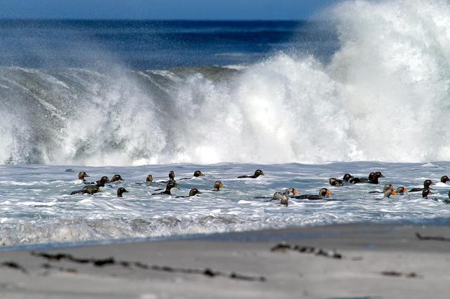 Wenn sie von der Nahrungssuche wieder an Land zurückkehren, erscheinen sie in der Ferne zunächst wie ein schwarzes Band auf dem Meer. Doch dann müssen sie sich durch die Brandung kämpfen, und die ist nicht ohne. Wenn sie schließlich wieder den Strand erreichen, hat man fast das Gefühl, ihnen applaudieren zu müssen. Jeder einzelne von ihnen scheint ein kleiner Held zu sein, der die Herausforderungen des wilden Ozeans gemeistert hat. Man versteht, warum sie nun stolz watschelnd den Strand entlangpatrouillieren und dabei nach Caracaras Ausschau halten. Diese Greifvögel der Insel lauern möglicherweise darauf, die Schwäche des ein oder anderen Tieres nach der Anstrengung auszunutzen – auch sie sind auf Nahrungssuche. Doch es ist nicht nur der Mut der Dampfschiffenten, der einen in seinen Bann zieht. Es ist auch das soziale Miteinander dieser Tiere: wie sie sich in Gruppen bewegen, gemeinsam den Schutz des Strandes suchen und einander bei der Navigation durch die Brandung helfen.