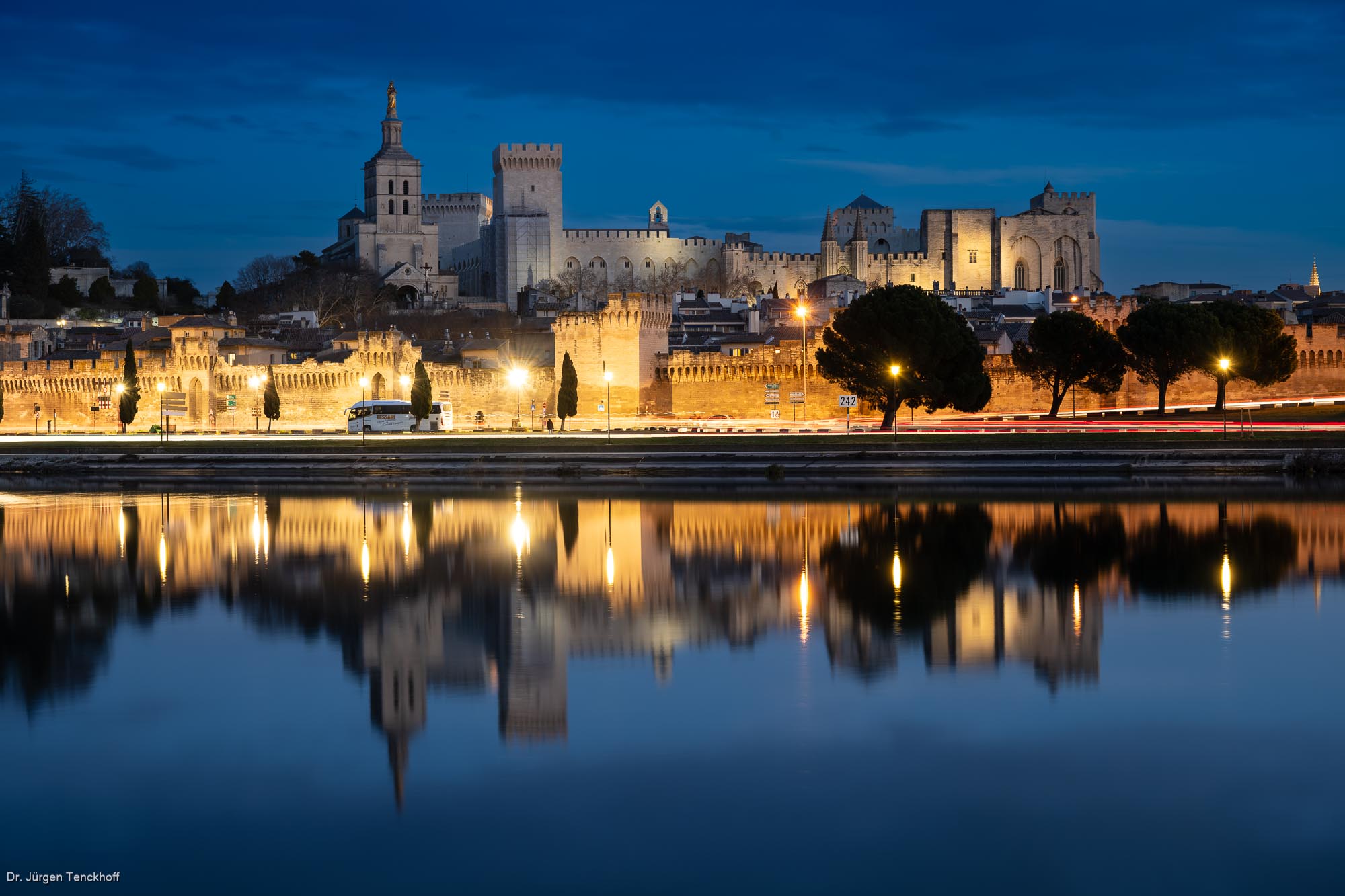 If you sit down on one of the many benches on the opposite bank of the Rhône in Avignon in time for sunset and the weather cooperates, you will see the wonderful reflections of the city with the former palace of the Popes in the Rhône towering above it. Of course, from there you can also see the illuminated Pont Saint-Bénézet bridge from the 15th century folk song "Sur le pont d'Avignon". But there is even more to see at blue hour, because with suitable camera settings you can, for example, make the halos of the lanterns on the bridges and on the streets appear and the car bridge even appears as a frame for the ships on the other bank of the Rhône.