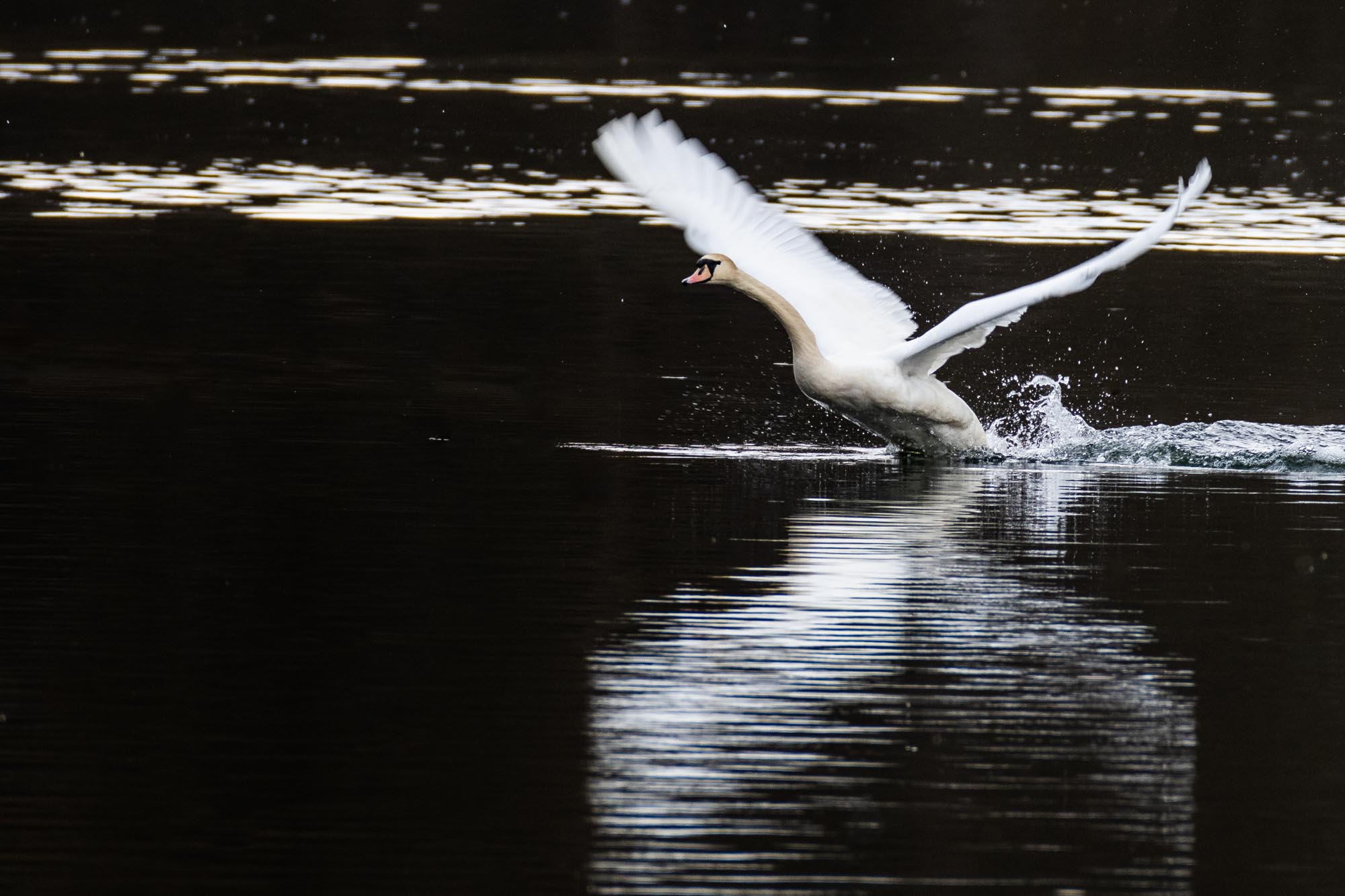 The ponds around Herrnstein Castle near Ruppichteroth in the Rhein-Sieg district always offer opportunities for beautiful animal photos. Today the waters were mainly populated with many mute swans, but rust and Canada geese as well as pond and coot also attracted attention. We had a tripod with us for the Nikkor 200 - 500 mm f / 5.6, but this beautiful lens can also be used by hand thanks to the VR II image stabilization. The first recording of this post is therefore a "camera puller". During the recording, one tries to synchronize the movement of the camera with the movement of the object, which in this case worked surprisingly well when focusing on the swan's head - a bit of luck is required.