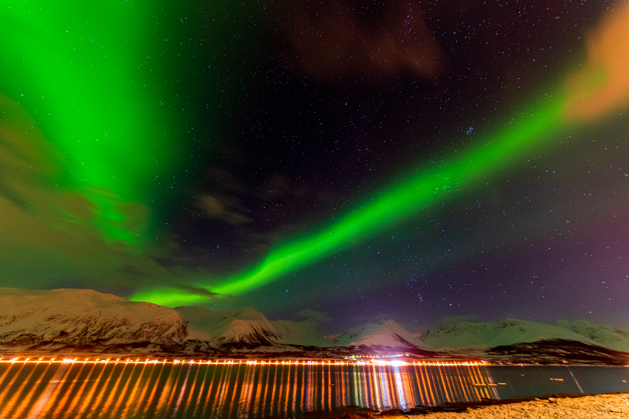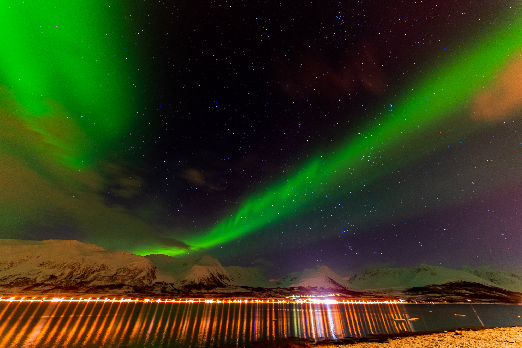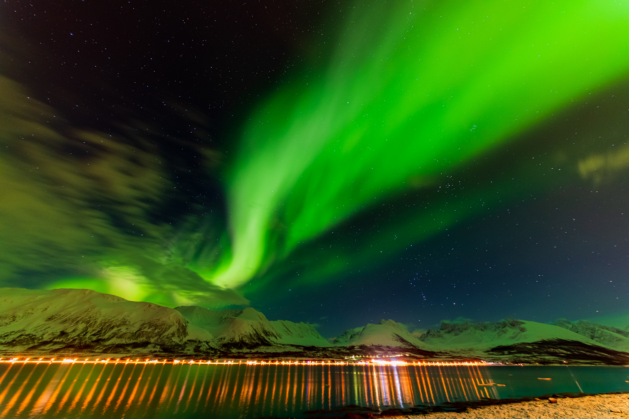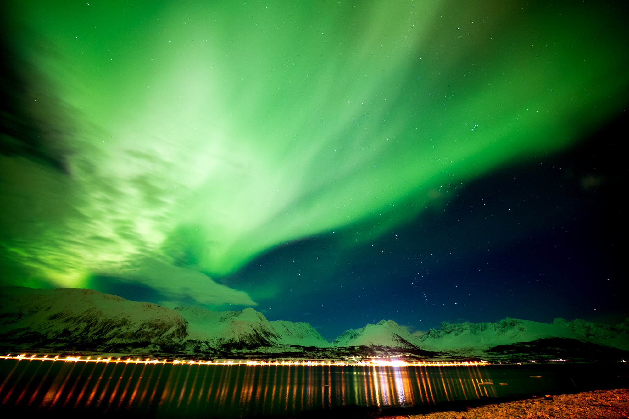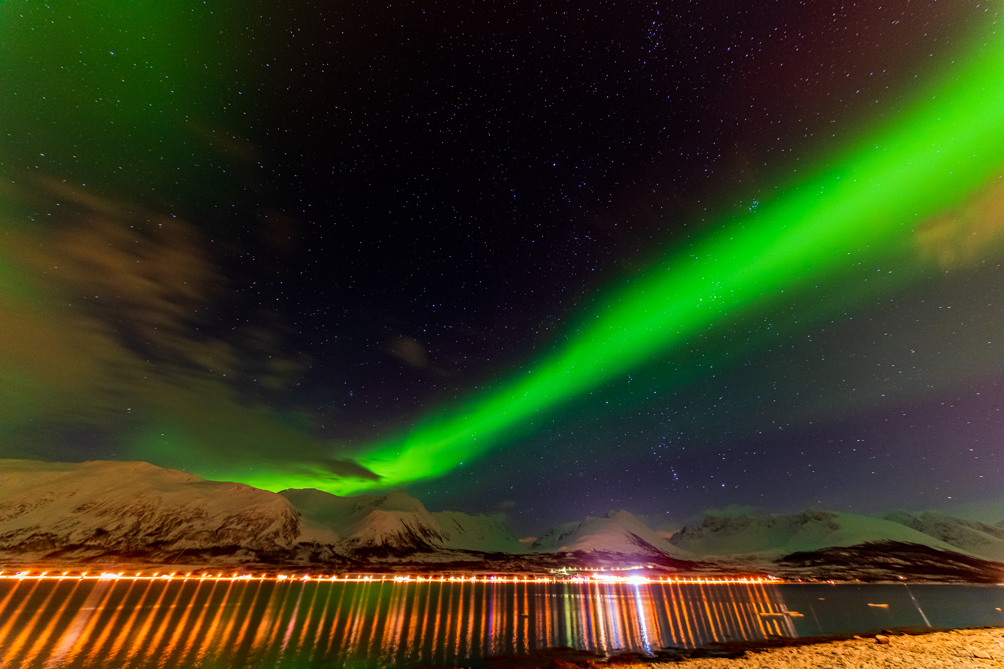 The lights become more and more powerful and quickly merge, so that the entire sky is finally covered with bright green and the landscape is illuminated with a spectacular greenish light.