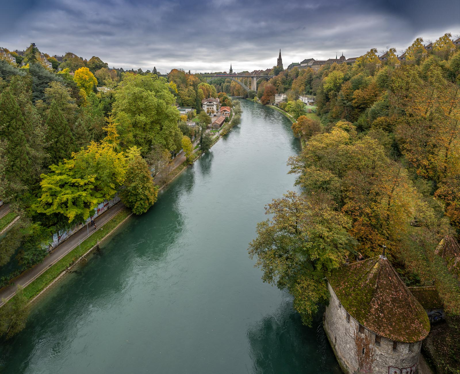 Bern is one of the most beautiful cities in Switzerland and was built around a hill surrounded by six kilometers of arcades with many small shops. This ensemble is surrounded by the Aare, whose course here is reminiscent of the Saar and Ardeche loops. From the Lorraine Bridge, to which two impressive sculptures provide access, you can take photos of the first impressive views of the city. From here, narrow steps lead down to the Blood Tower, through which the river path leads. A few kilometers from this point you reach Bärenplatz, where you can not only see brown bears, but also a beautiful view of the Nydegg Bridge provides the next photo opportunity. The bridge connects the area of the Nydegg Church in the old town of Bern with the opposite bank of the Aare at the Bärengraben. A road leads from here to the Rosengarten, from where you can see more beautiful views of Bern.