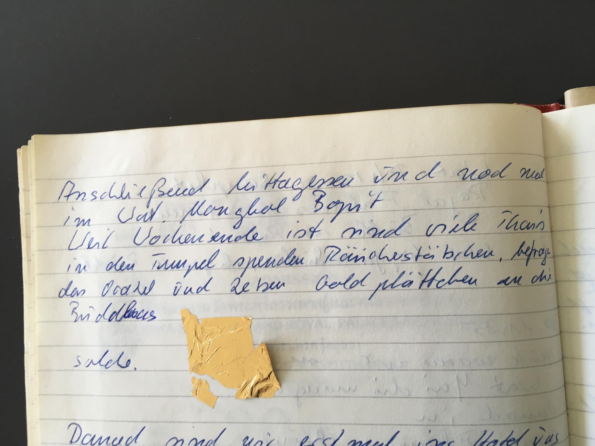 Aus einem Thailändischen Tempel nahm ich ein Goldplättchen mit, das die Gläubigen auf Buddhafiguren kleben. Die Buddhas sehen dadurch allerdings mit der Zeit recht unförmig aus.