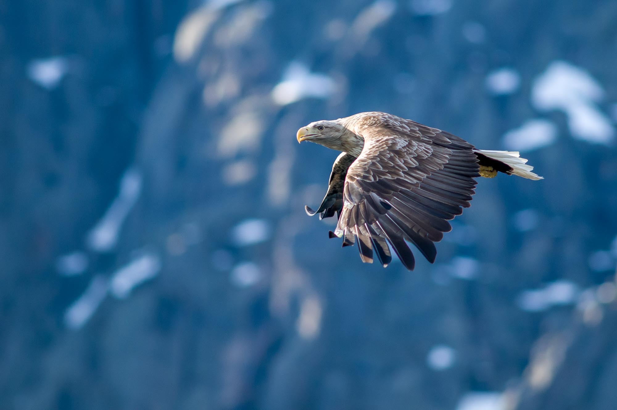 Seeadler gehören zu den größten Greifvögeln Europas und sind weder im Flug noch auf der Erde oder in Bäumen kaum verwechselbar. In Norwegen konnten wir sie von unserem kleinen direkt am Meer gelegenen Häuschen fotografieren doch die beeindruckensten Aufnahmen gelangen bei einer Bootsexkursion zum Trollfjord wo wir sie bei der Fischjagd fotografieren konnten. Optimal waren die hochaufragenden Felsen als Hintergrund für die Auge-in-Auge-Aufnahmen.