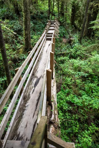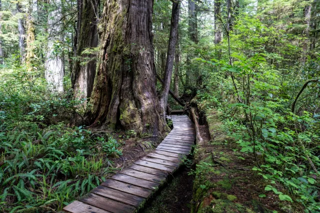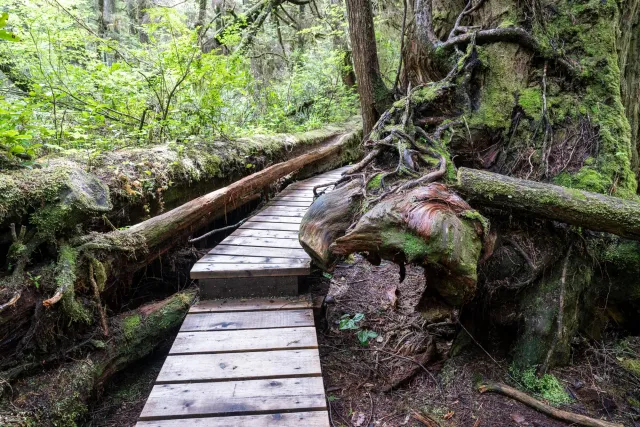 Vancouver Island ist ein Ort voller Magie – besonders in seinen Wäldern, wo Licht und Schatten miteinander tanzen. An der Westküste, zwischen Tofino und Ucluelet, durchquert man auf soliden, kilometerlangen Holzstegen einen Regenwald, der mit seiner urtümlichen Vegetation an einen verwunschenen Dschungel erinnert. Der Zugang liegt direkt an der Autostraße 4 – auf beiden Seiten der Straße führen gut ausgebaute Wege in das grüne Herz des Waldes.