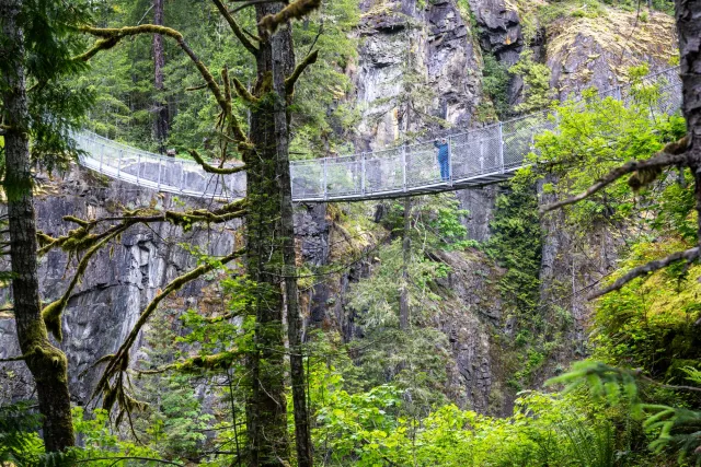 Ein besonderes Highlight ist der Elk-Wasserfall im Elk Falls Provincial Park. Der Weg dorthin führt durch ursprüngliche Wälder, vorbei an Douglasienriesen und über gepflegte Holzstege. Am Ende wartet ein architektonisches Meisterwerk: eine 64 Meter hohe Hängebrücke, die sich in luftiger Höhe über die Schlucht spannt. Mit einer Länge von 60 Metern ist sie die höchste Fußgängerbrücke auf Vancouver Island und wurde 2015 eröffnet. Von hier aus blickt man direkt auf die rund 25 Meter tief stürzenden Wassermassen des Elk Falls – ein atemberaubendes Naturschauspiel, das donnernd in die Tiefe rauscht.
