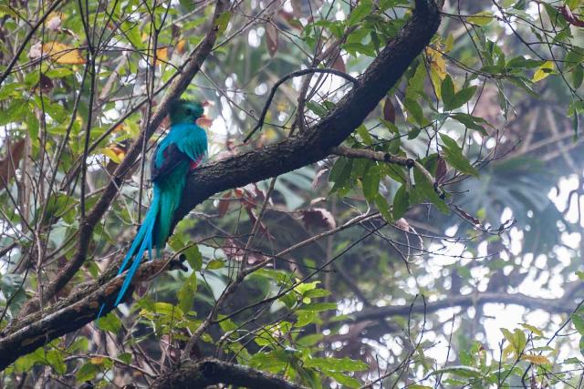 Der Quetzal gehört zu der Gattung der Trogone, von der wir noch eine weitere Art, den Bergtrogon, in Panama fotografieren konnten. Die Vögel sind sehr farbenprächtig und der Quetzal hat noch zwei weitere Merkmale, die ihn außergewöhnlich erscheinen lassen. Zum einen besitzt er sehr lange Schwanzfedern. Diese machten ihn zum beliebten Jagdobjekt der präkolumbianischen Kulturen, deren Priester ihren Kopfschmuck mit den prächtigen Federn ausstatteten. Allerdings wurde der Quetzal bei den Atzteken als Gottheit Quetzalcoatl verehrt, so dass die Vögel zwar gefangen und um ihre Schwanzfedern beraubt werden durften - aber ihre Tötung stand unter Todesstrafe. Außergewöhnlich ist der engelsgleichc Gesang des Quetzal, der in der Paarungszeit besonders betörend wirkt. Er ist bei Sonnenaufgang zu hören, so dass wir von unserer Teeplantage noch im Dunkeln aufbrachen, um rechtzeitig an den vermuteten Orten im Dschungel einzutreffen.