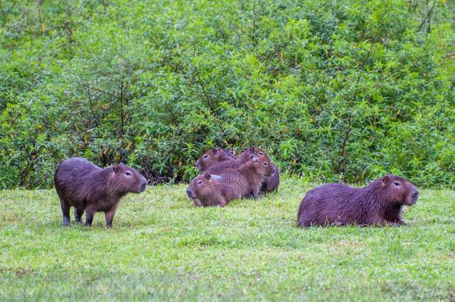 Als der Physiker Shelden Cooper in der Serie Big Bang Theory seinen Freunden das Mittagessen mit der Geschichte von den kotfressenden Capybaras verekelte, wurden diese possierlichen Riesennager etwas unglücklich bekannt. Diese Wasserschweine aus der Familie der Meerschweinchen haben sicher eine angemessenere Betrachtung verdient - so war es ein Vergnügen, diese sozialen Tiere in einem Sumpfgebiet in Gamboa zu beobachten und zu sehen, wie die ausgewachsenen Tiere ihrem Nachwuchs Schutz gewähren, sie miteinannder spielen und gemeinsam zur Nachrungssuche aufbrechen.