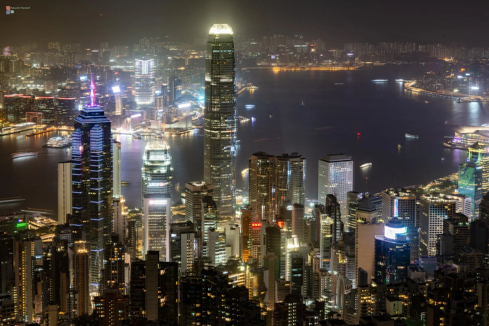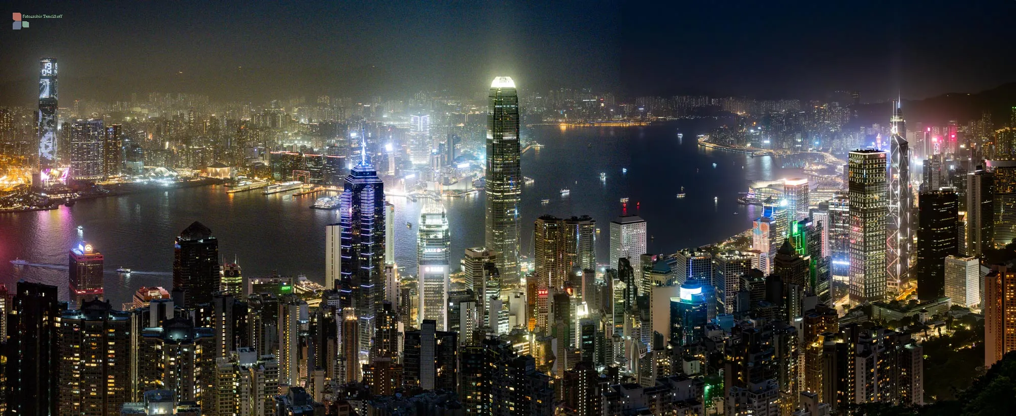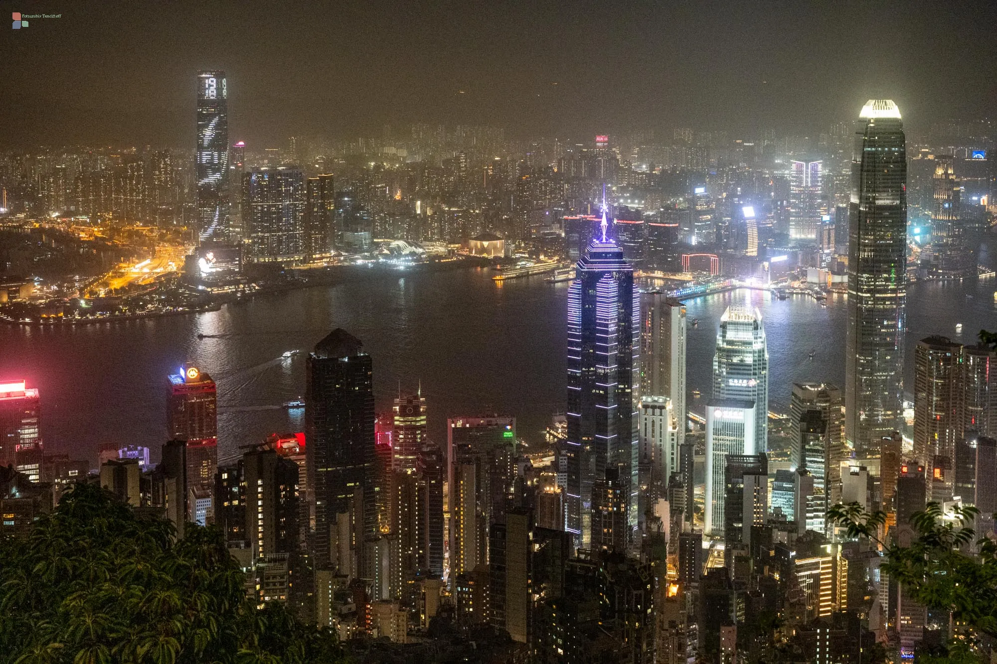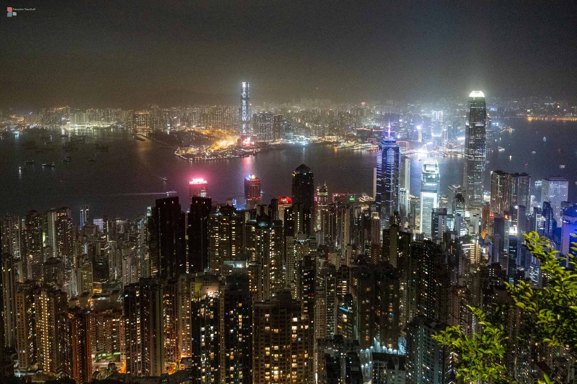 Der Ausblick dort ist unvergesslich. Und wie erwartet, füllte sich der Platz bei Einbruch der Dämmerung rasch mit Fotografen. Doch da wir rechtzeitig vor Ort waren, sicherten wir uns eine gute Position für unser Stativ – mit freier Sicht auf den Victoriahafen und die gegenüberliegende Skyline.