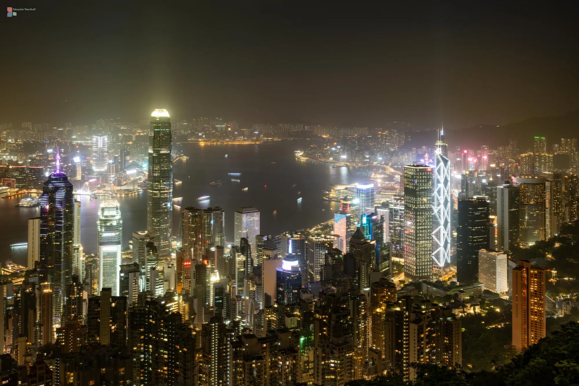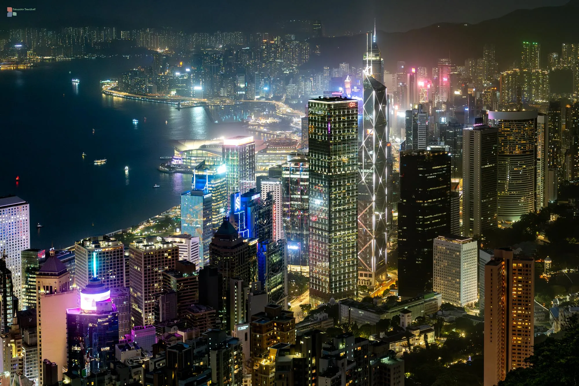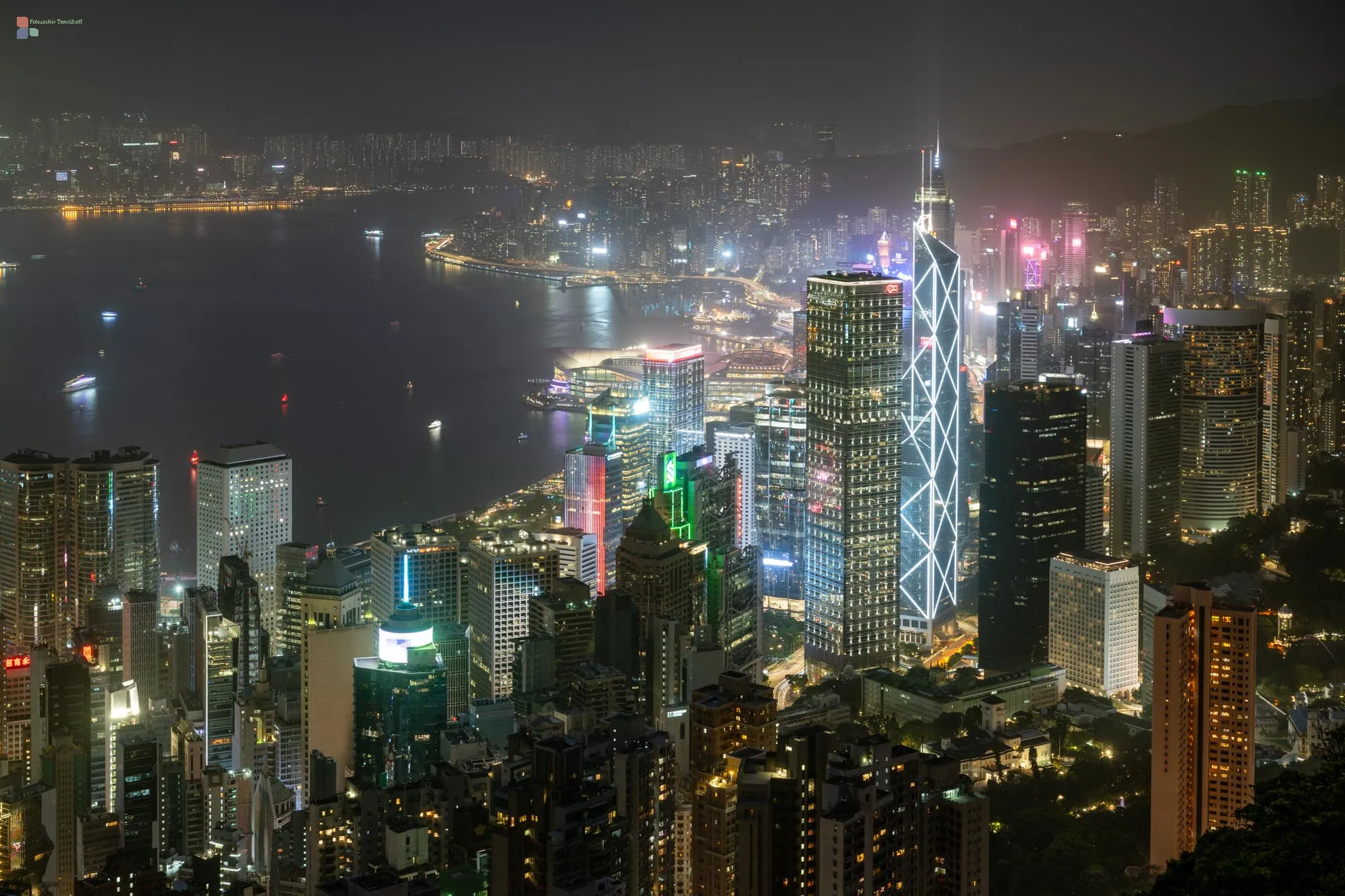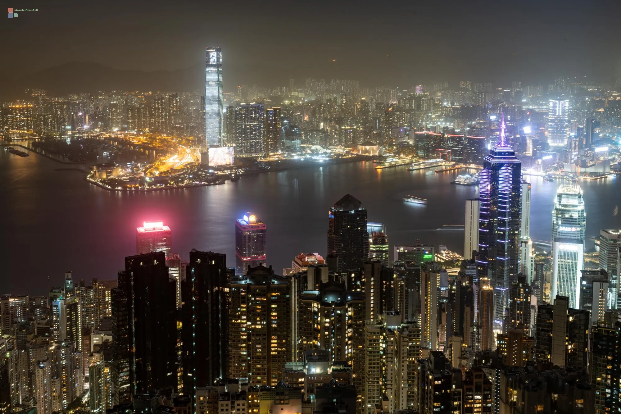 Der Ausblick dort ist unvergesslich. Und wie erwartet, füllte sich der Platz bei Einbruch der Dämmerung rasch mit Fotografen. Doch da wir rechtzeitig vor Ort waren, sicherten wir uns eine gute Position für unser Stativ – mit freier Sicht auf den Victoriahafen und die gegenüberliegende Skyline.