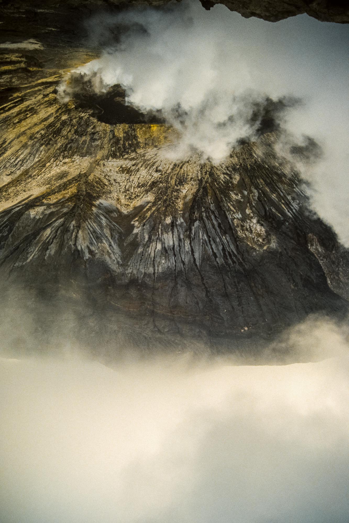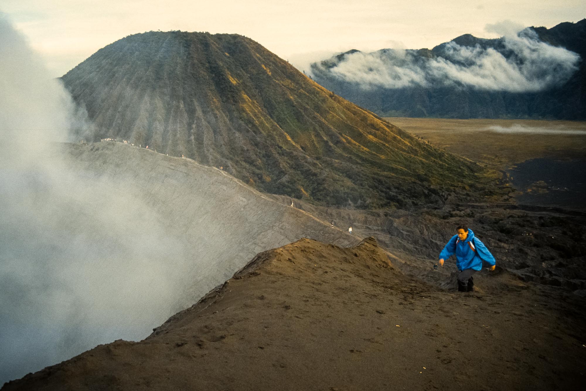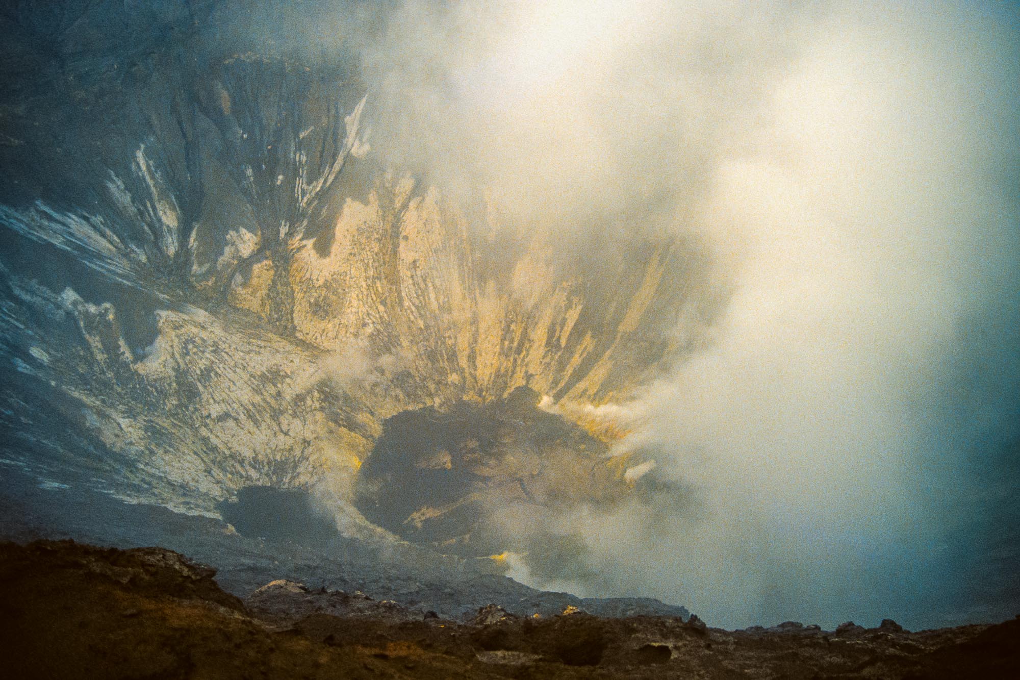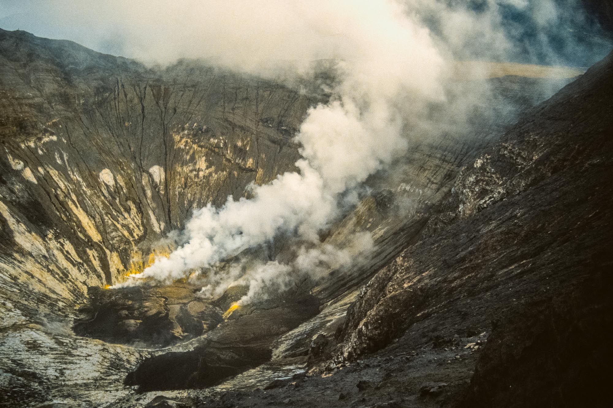 Vor Sonnenaufgang begann 1989 die Wanderung durch eine ausgedehnte Caldera zum Gunung Bromo, einem 2329 m hohen Stratovulkan auf der indonesischen Insel Java. In dem kleinen Ort am äußeren Rand der Caldera hatten wir die Nacht verbracht und waren gespannt auf die Vulkankegel des Penanjakan und des Semeru. Der Bromo ist ein sehr aktiver Vulkan, der mit plötzlichen Eruptionen zu überraschen weiß und daher von seinen Besuchern große Vorsicht verlangt. Wir durchquerten die Caldera zu Fuß und die ungewöhnliche Landschaft erzeugte eine eigenartige Stimmung, so dass selbst Dinosaurier zwischen den Vulkankegeln nicht überrascht hätten.