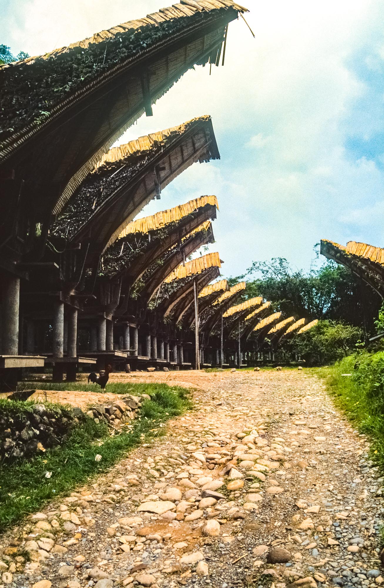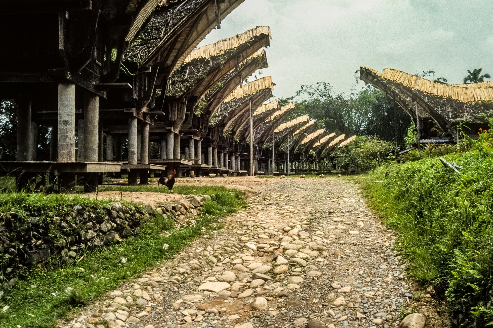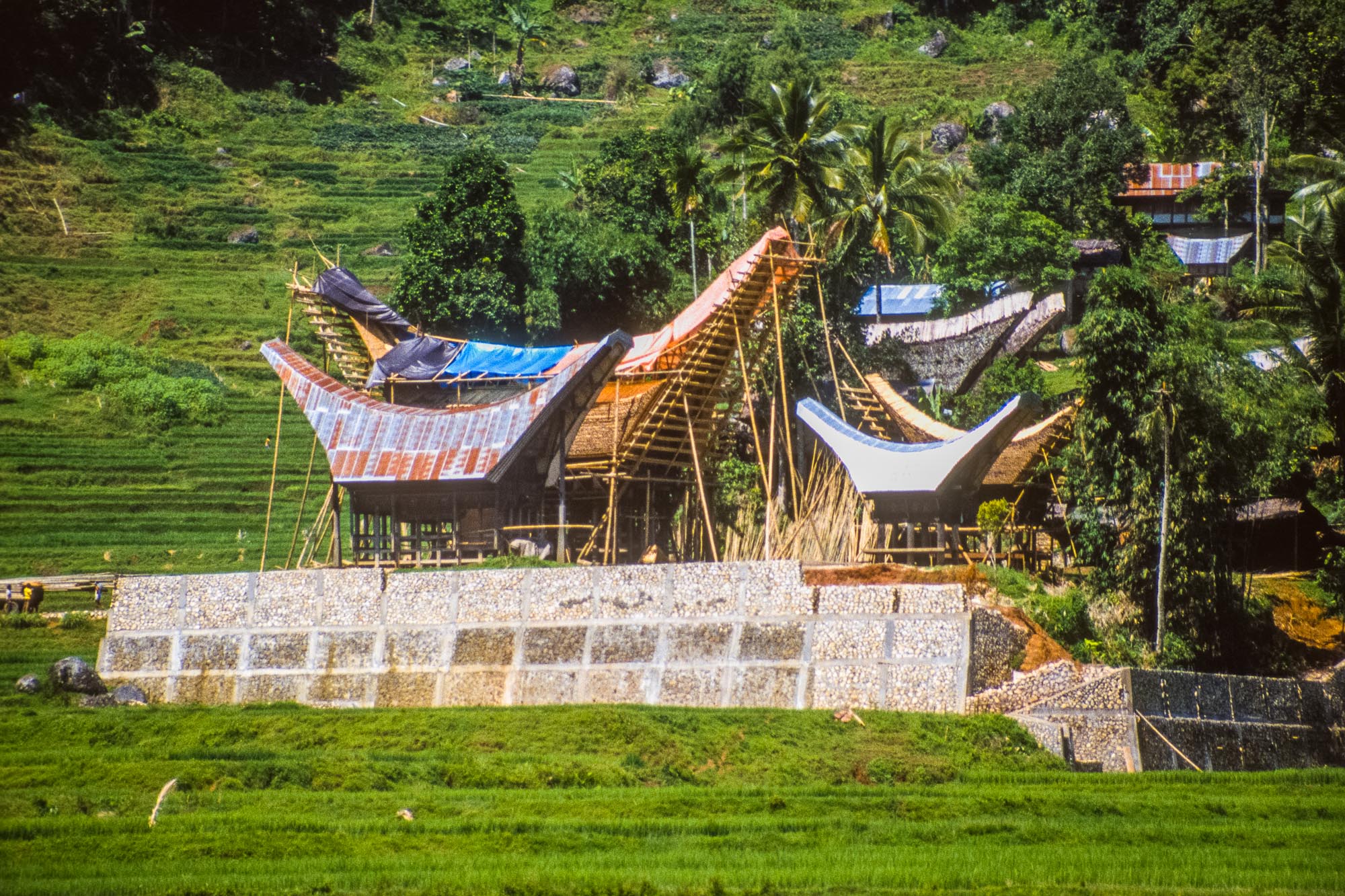 Der Bau eines Tongkonan ist sehr aufwändig und seine Konstruktion kommt ohne Nägel oder Schrauben aus. Ein Dorf besteht aus zwei Reihen an Tongkonans, die sich gegenüber stehen. Den Wohnhäusern auf der einen Seite stehen in ähnlicher Konstruktion die Reisspeicher gegenüber - alle auf Holzpfählen.