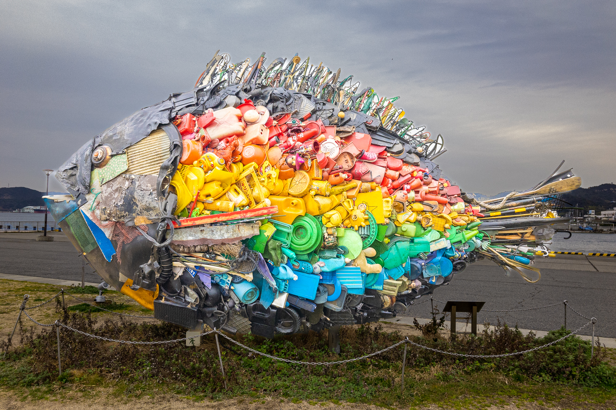 Man gelangt auf die Insel z.B. vom Fährhafen Uno aus. Hier begeistern bereits die Installationen des "Black Porgy" von Yodogawa Technique. Plastikmüll, achtlos ins Meer geworfen, wurde von ihm gesammelt und als Mahnmal zu einem riesigen Fisch zusammengefügt. Eine weitere ähnliche Konstruktion in der Nähe ist sogar begehbar und bereitet den Kindern großen Spaß während die Erwachsenen nachdenklich werden.