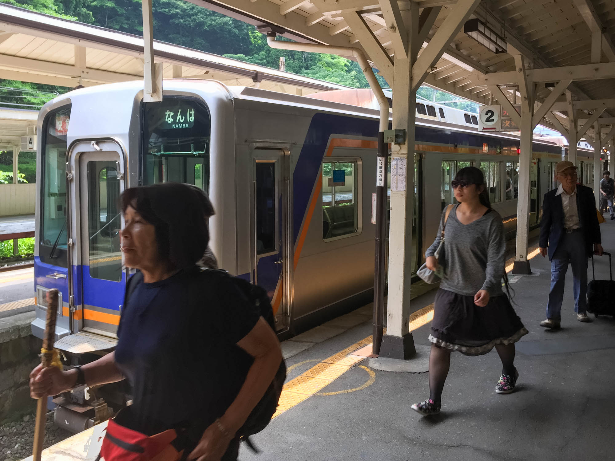 13:43 mit der Osaka-Kanjyō-Line nach Shin-Imamiya, 14:02 mit der Nankai Railway nach Gokurakubashi („Goldene Brücke“),