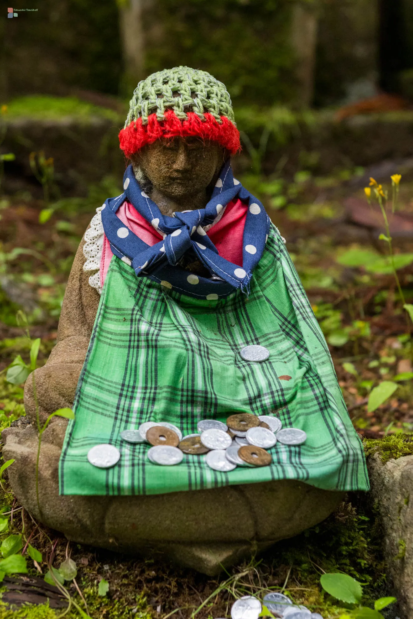 Nobo zeigt uns die vielen Jizō-Figuren, kleine steinerne Gestalten mit roten Lätzchen und Mützchen, die über Kinder, Reisende und Verstorbene wachen.