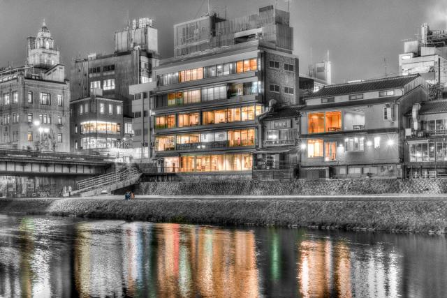 Einzelheiten hervorzuheben, das ist die Möglichkeit, die die Transfromation einer Aufnahme zu einem Colorkey-Bild bietet. Das junge Paar in Farbe vor dem Restaurant am Fluss Kamo in Kyoto zusätzlich zur der ausgesuchten Schlüsselfarbe, die besetzten Tische im Restaurant ... von diesen Motiven will dieses Colorkey-Bild erzählen.