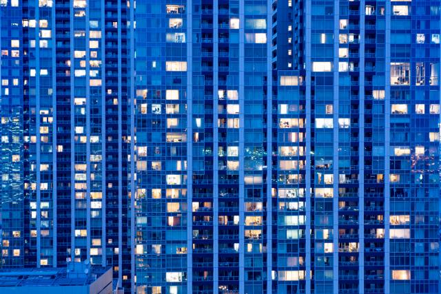 Wenn zur Blauen Stunde die Menschen daheim sind und die Beleuchtungen ihrer Wohnungen einschalten, erzielt man einzigartige Aufnahmen von Wohnhäusern mit ausladenden Fensterfronten. Bei einer unserer Japanreisen gelang uns aus dem Fenster unseres Hotels in Tokyo, das eine passende Aussicht auf eine entsprechende Häuserfront besaß, diese Aufnahme zur Blauen Stunde. Bei dieser Darstellung wurden die durch Fenster sichtbaren Wohnbereiche weichgezeichnet (Photoshop), um die Privatsphäre der Bewohner sicherzustellen, da die eingesetzte Nikon D810 sehr detailgetreu abbildet.