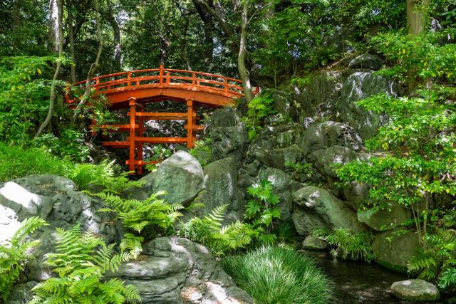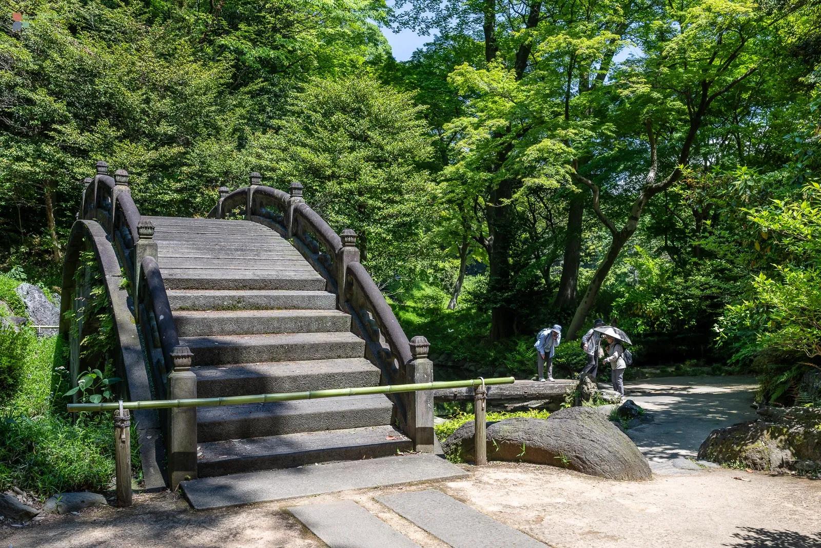 Der Koishikawa Kōrakuen ist einer der ältesten Gärten Tokios, angelegt in der frühen Edo-Zeit um 1629. Einst das Privatrefugium des Fürsten Tokugawa Yorifusa, vereint er chinesische Landschaftsideale mit japanischer Gartenkunst. Besonders eindrucksvoll ist die leuchtend rote Brücke, die über einen Bach führt – ein Fotomotiv, das sich nur in seiner ganzen Schönheit erschließt, wenn man den Mut hat, die mittleren Trittsteine im Wasserlauf zu betreten. Dann offenbart sie ihre Symmetrie, eingebettet in ein Meer aus Grün. Oder, die Brücke dominiert als rotes color-key eine schwarzweiße Natur, wie auf meiner Aufnahme aus dem Jahr 2013.