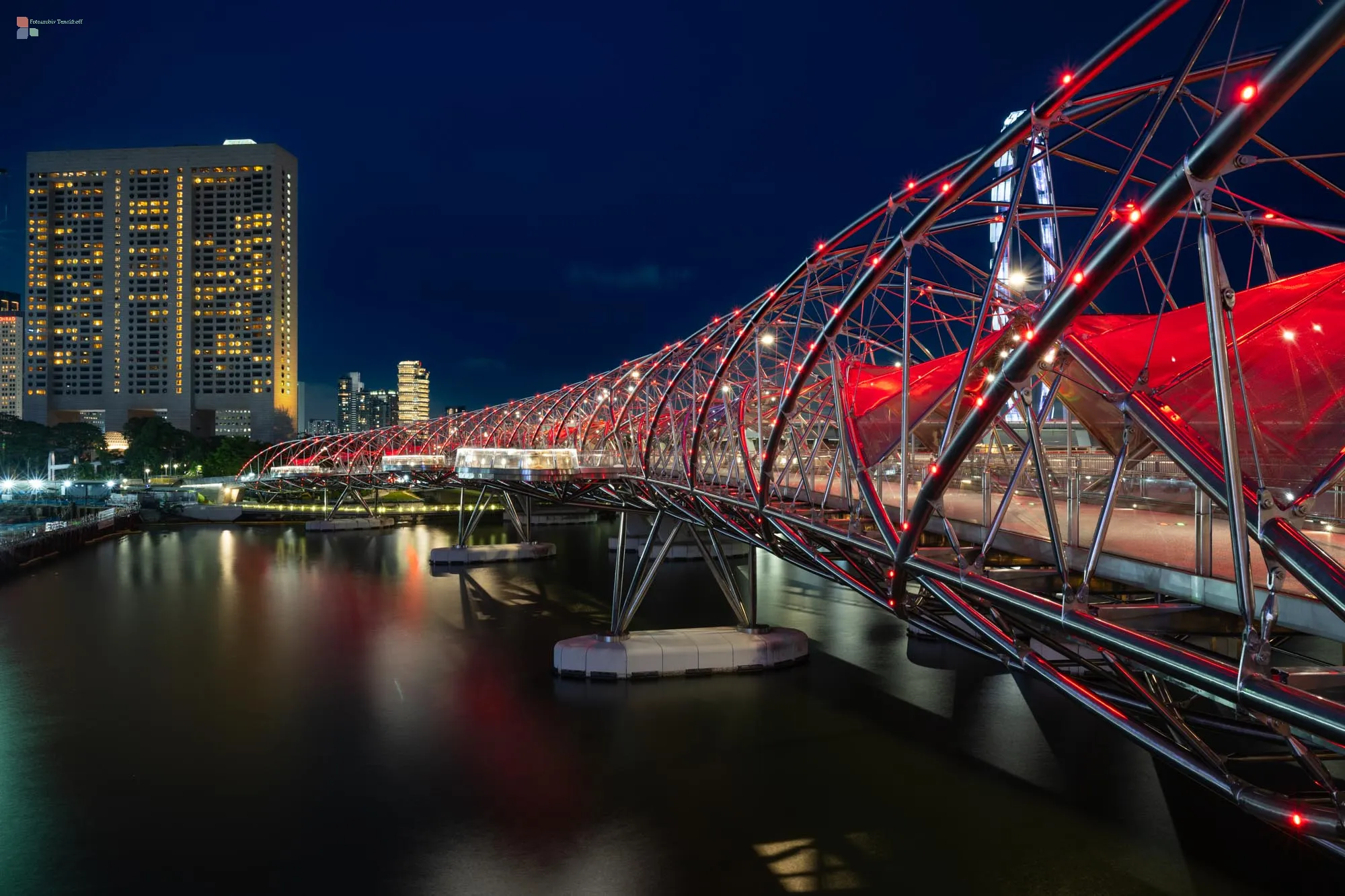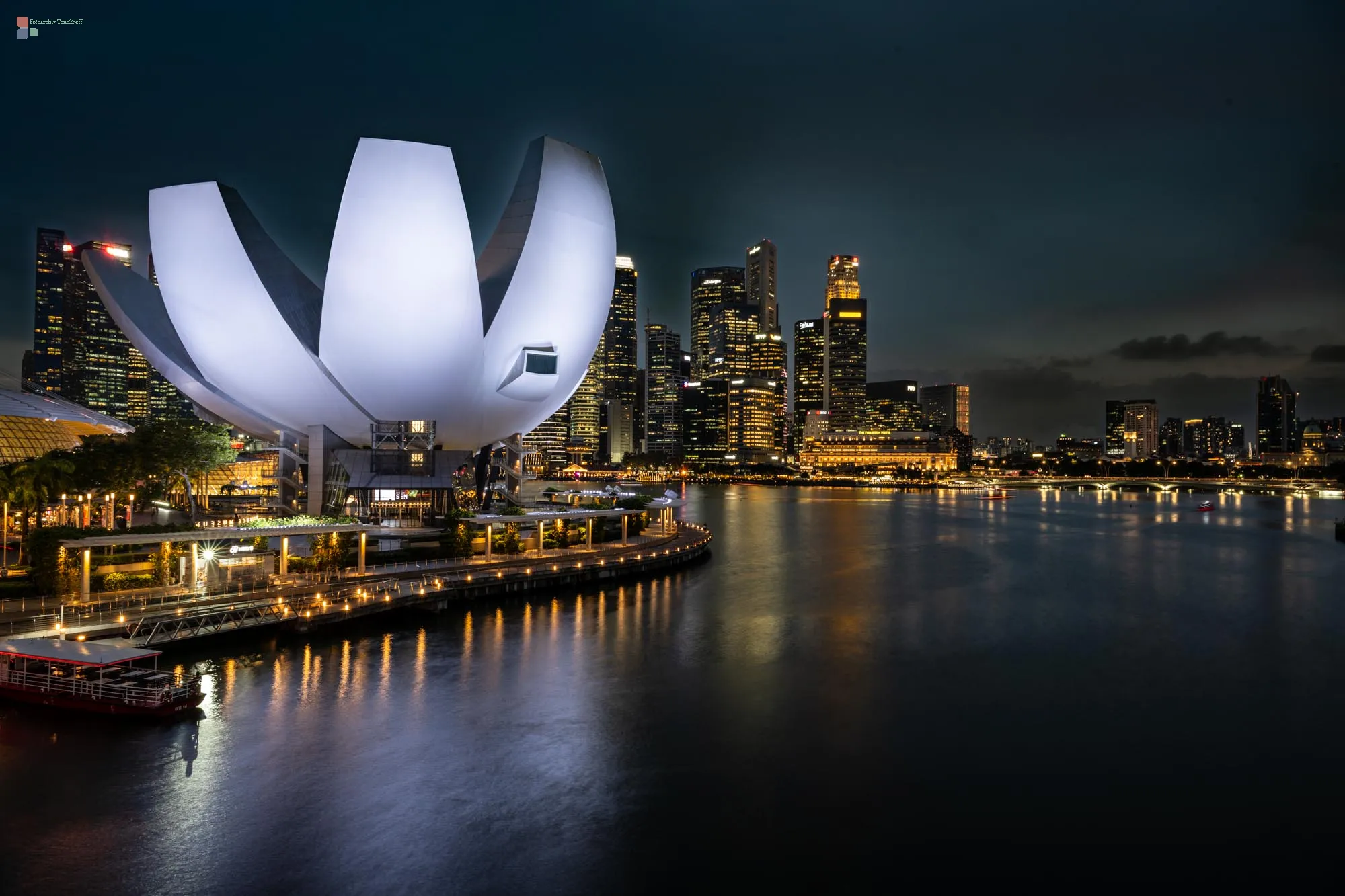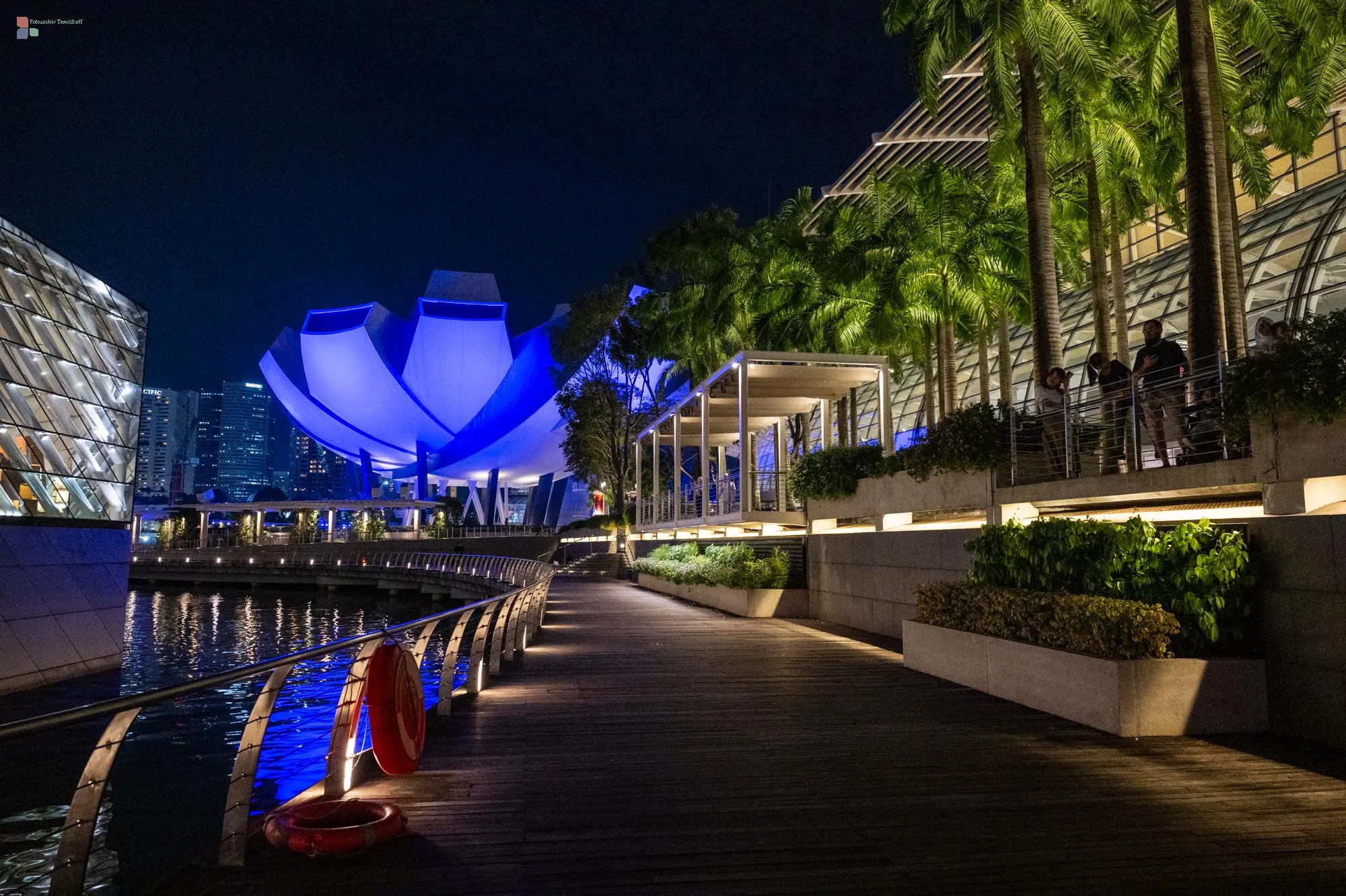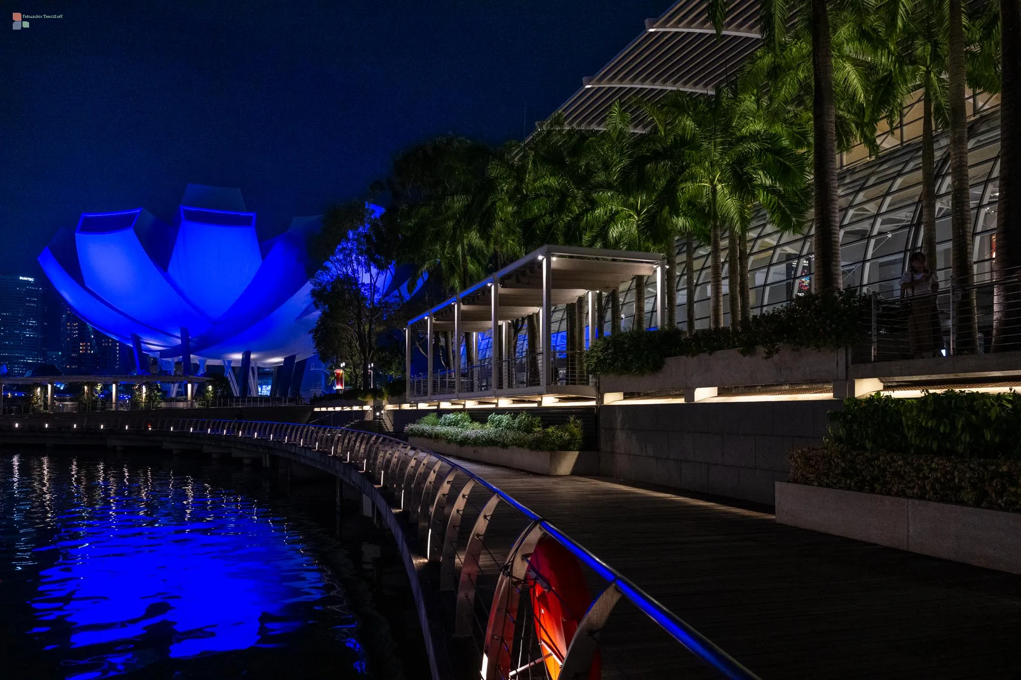 Wir schlenderten weiter zur berühmten Helix-Brücke – ein filigranes Wunderwerk aus Stahl, das sich wie eine DNA-Struktur in die Nacht schraubt. Dazu das futuristische ArtScience-Museum, dessen Form an eine geöffnete Hand erinnert, die dem Himmel entgegengestreckt ist.