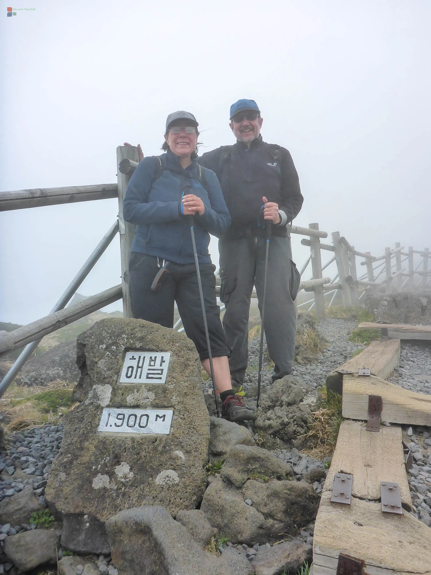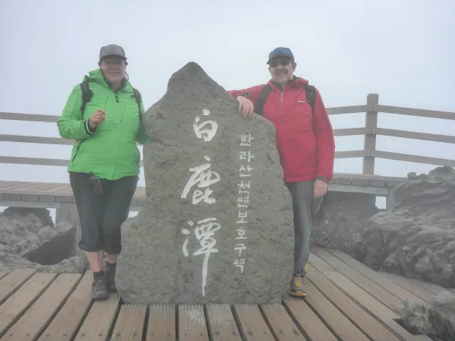 Zum Beweis unserer Anwesenheit haben wir neben dem Gifelstein ein Foto von uns gemacht. Dafür standen wir sogar in einener Warteschlange an. Aber! Mit diesem Beweisfoto gab es unten bei der Parkverwaltung ein Zertifikat für die Besteigung des Hallasan. Der Weg abwärts war ganz schön anstrengend.