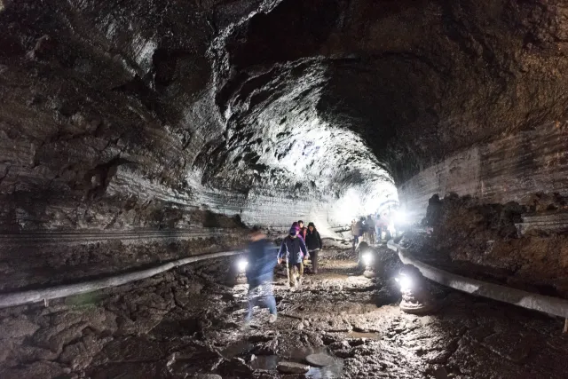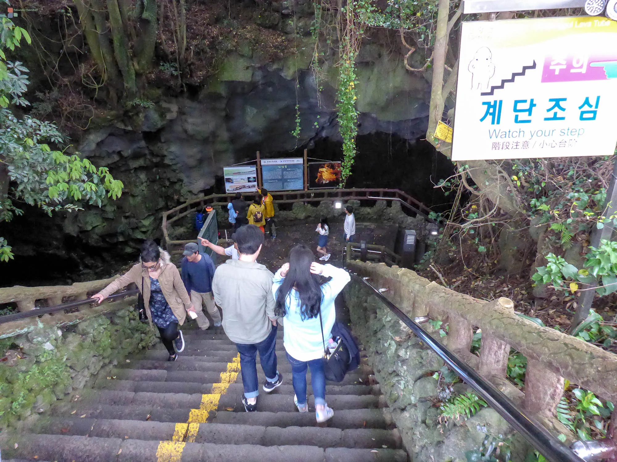 Ein weiteres mit dem Bus schlecht zu erreichendes Ziel war die Manjanggul Lavahöhle. Man betritt die Lavahöhle über eine in die Tiefe führende Treppe. Unten angekommen steht man in einer riesigen langen Lavaröhre. Wir haben rund um die Welt schon einige dieser sogenannen Lavatubes besucht, aber die auf Jeju war überwältigend. Die Röhre ist ca. 14 km lang und man kann sie als Besucher auf einer Länge von 1 km begehen. Dieser Teil der Höhle ist 3 bis 20 Meter breit und zum Teil ebenso hoch. Das Ende ist ein beliebter Fotospot. Dort traffen wir eine koreanische Touristin, die mit einer Polaroidkamera unterwegs war. Als Dankeschön für das Foto, das wir von ihr gemacht hatten, gab es ein Poaroidfoto von uns, was natürlich mein Tagebuch schmückt. Die Höhle hat uns so begeistert, dass wir sogar ein zweites Mal dort waren - diesmal mit Stativ für bessere Fotos ausgerüstet, denn obwohl die Höhle fürs Durchgehen gut genug beleuchtet ist, für gute Fotos aus der Hand reicht die Beleuchtung nicht aus.