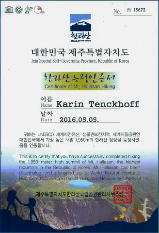 Fazit: Ein 20 km langer Wanderweg, ohne Ausblicke, weil wir immer im Wald waren, oben keine Aussicht, weil es nebelig war, heute Muskelkater, aber gelohnt hat es sich auf jeden Fall auf dem höchste Berg Südkoreas gewesen zu sein. Und auf dem Zertifikat ist ein schönes Foto vom Kratersee!