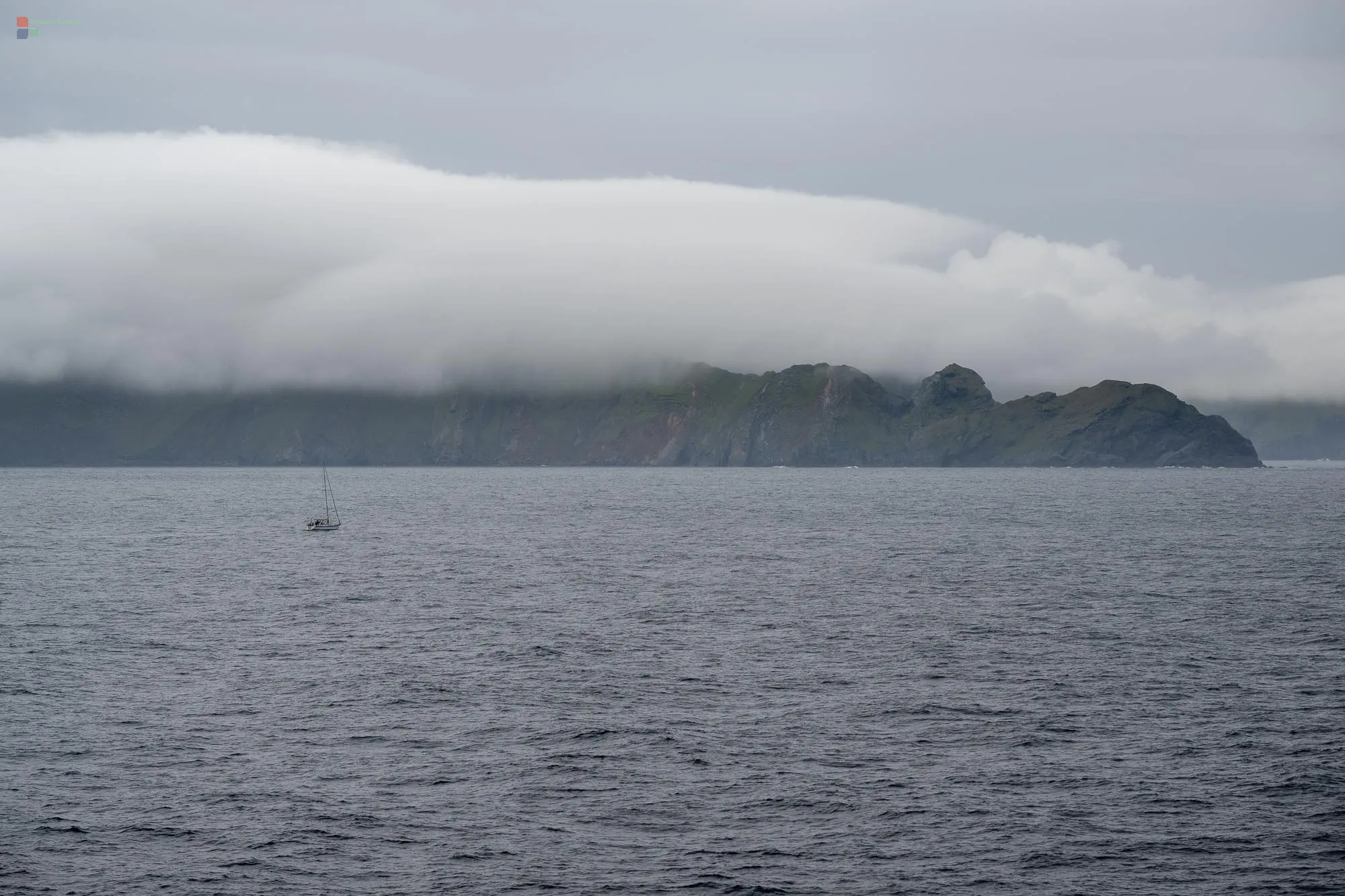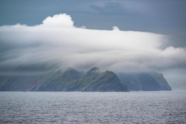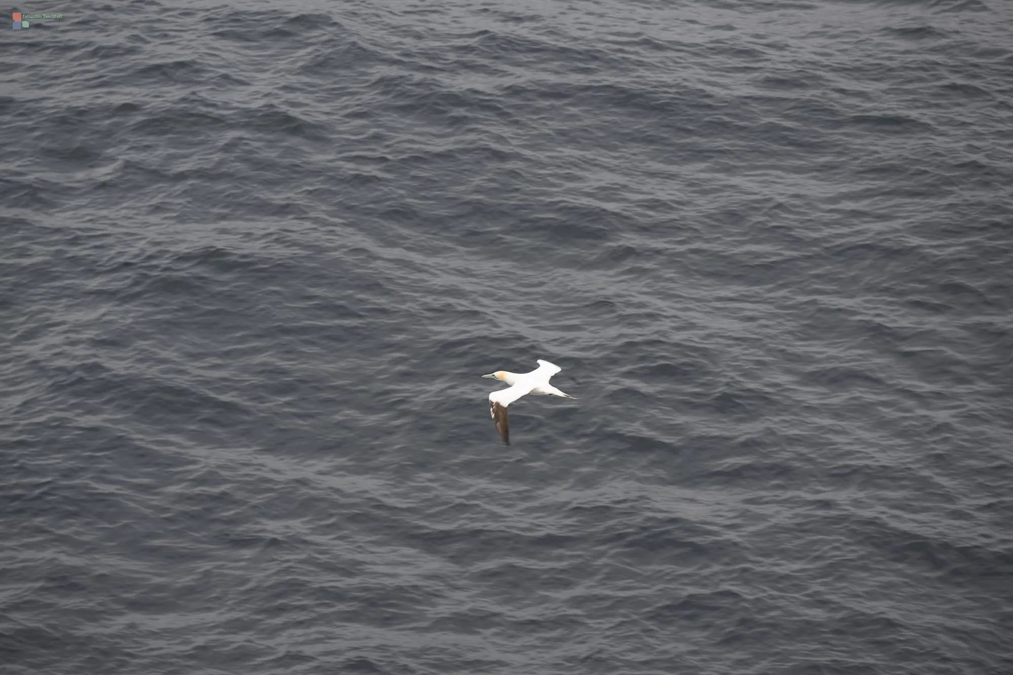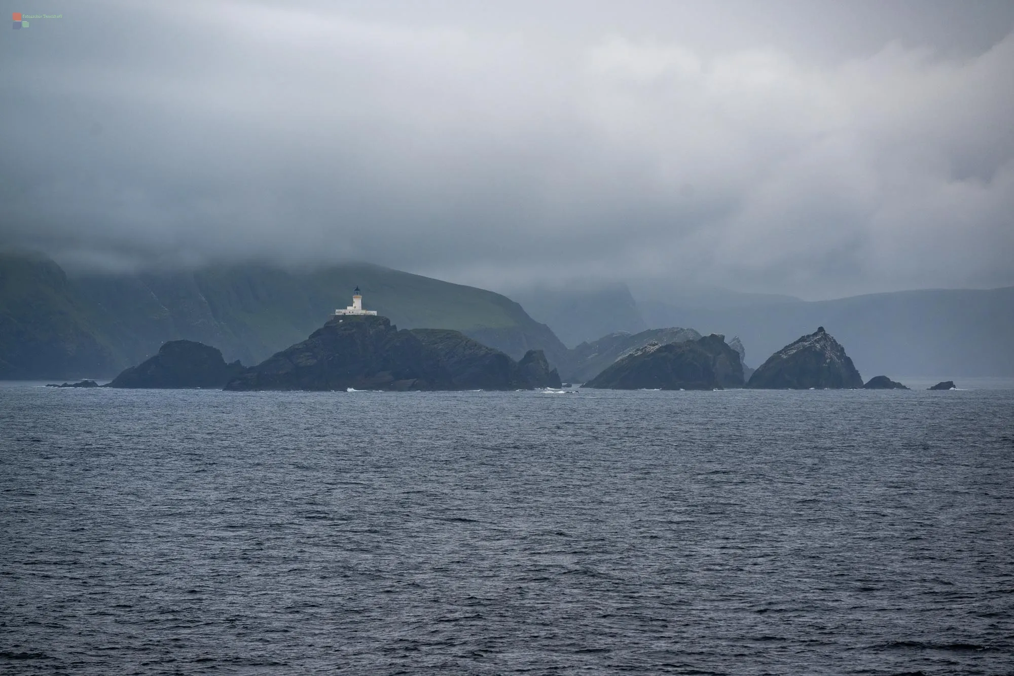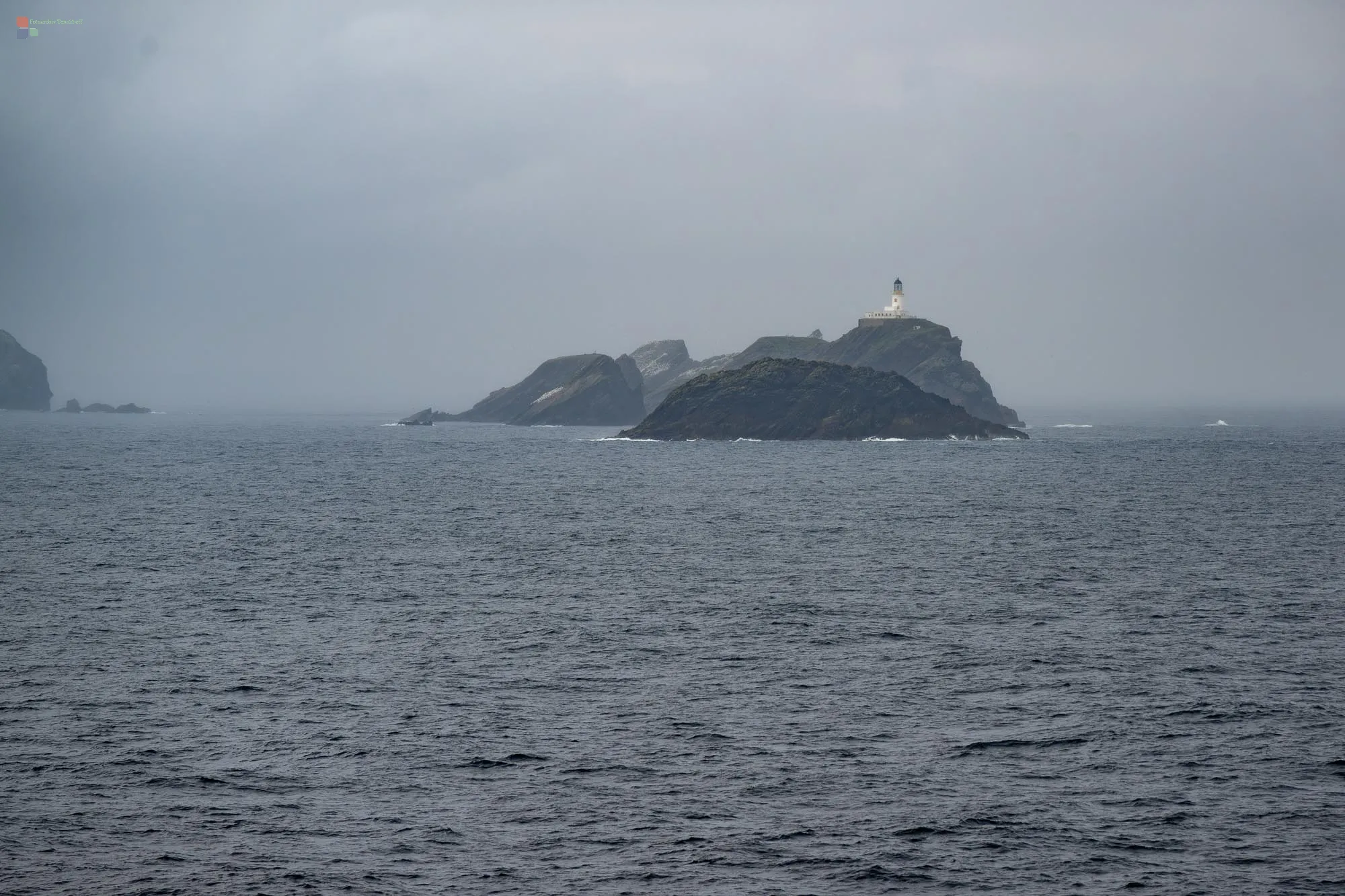 Schließlich taucht auch der Muckle-Flugga-Leuchtturm aus dem Wolkenmeer auf und man sieht auf seinen Felsen eine große Basstölpel Kolonie.