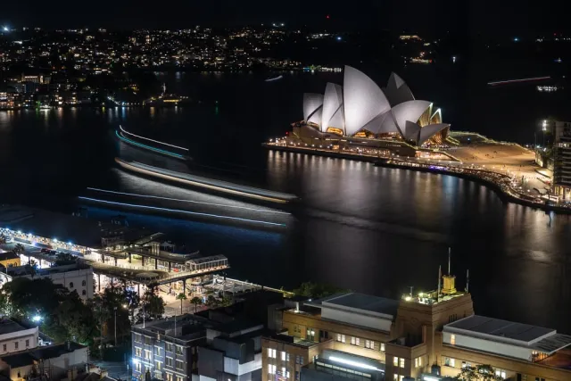 Mit Einbruch der Dunkelheit beginnt ein weiteres Schauspiel, das die Oper in Bewegung versetzt: „Badu Gili: Healing Spirit“, eine rund sechsminütige Projektion auf den östlichen Segeln der Oper, erzählt in vibrierenden Farben und fließenden Formen von der tiefen Verbindung zwischen Land, Wasser und Kultur.