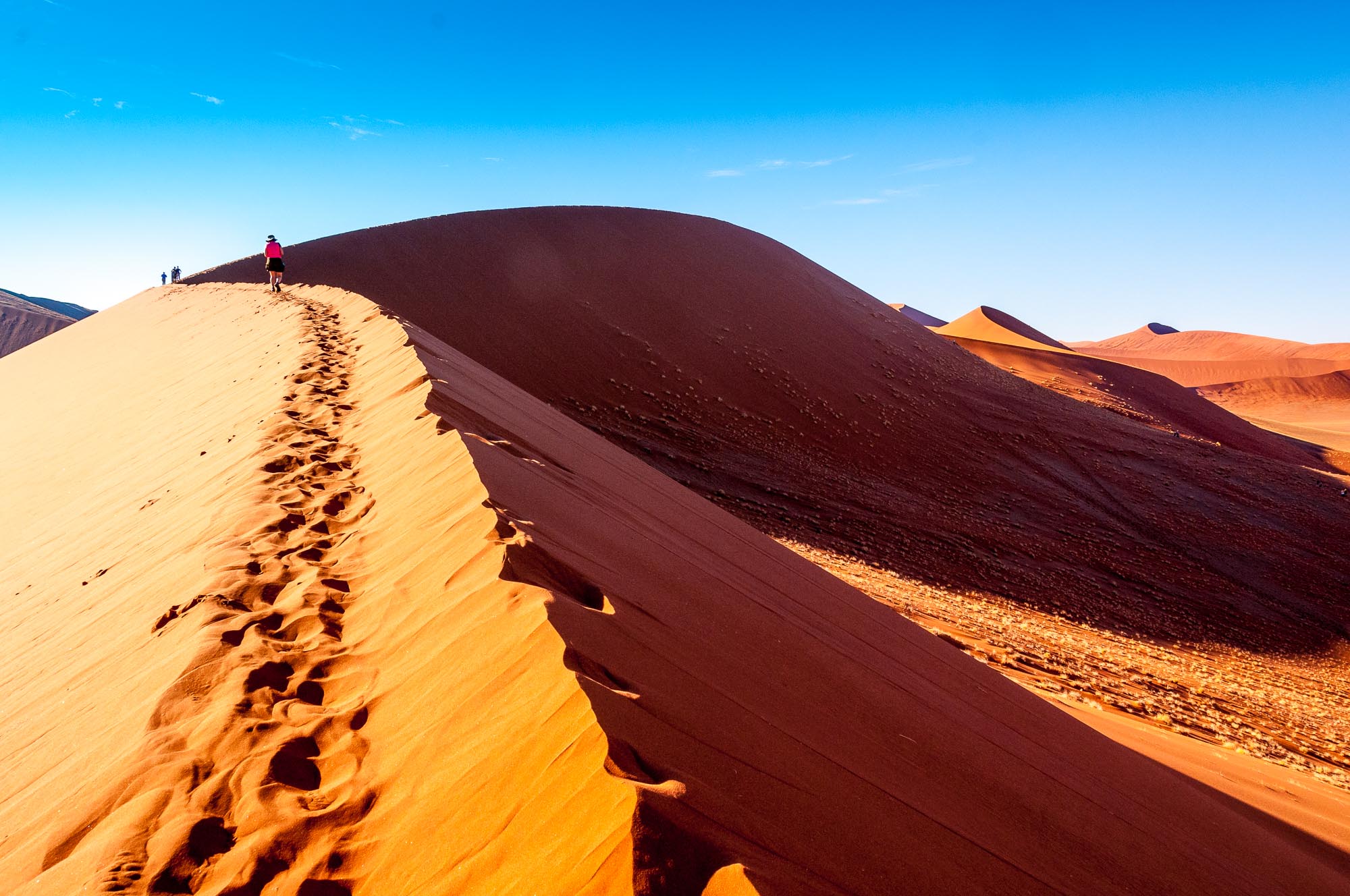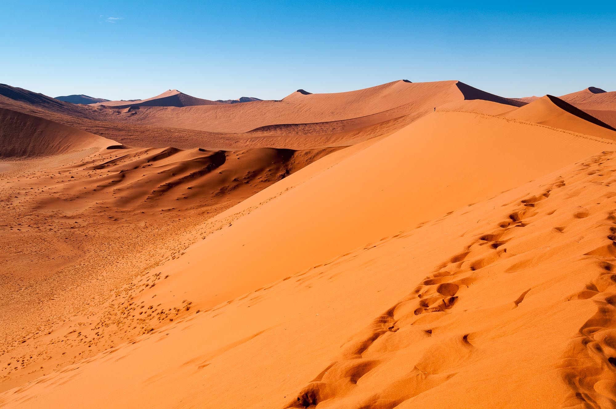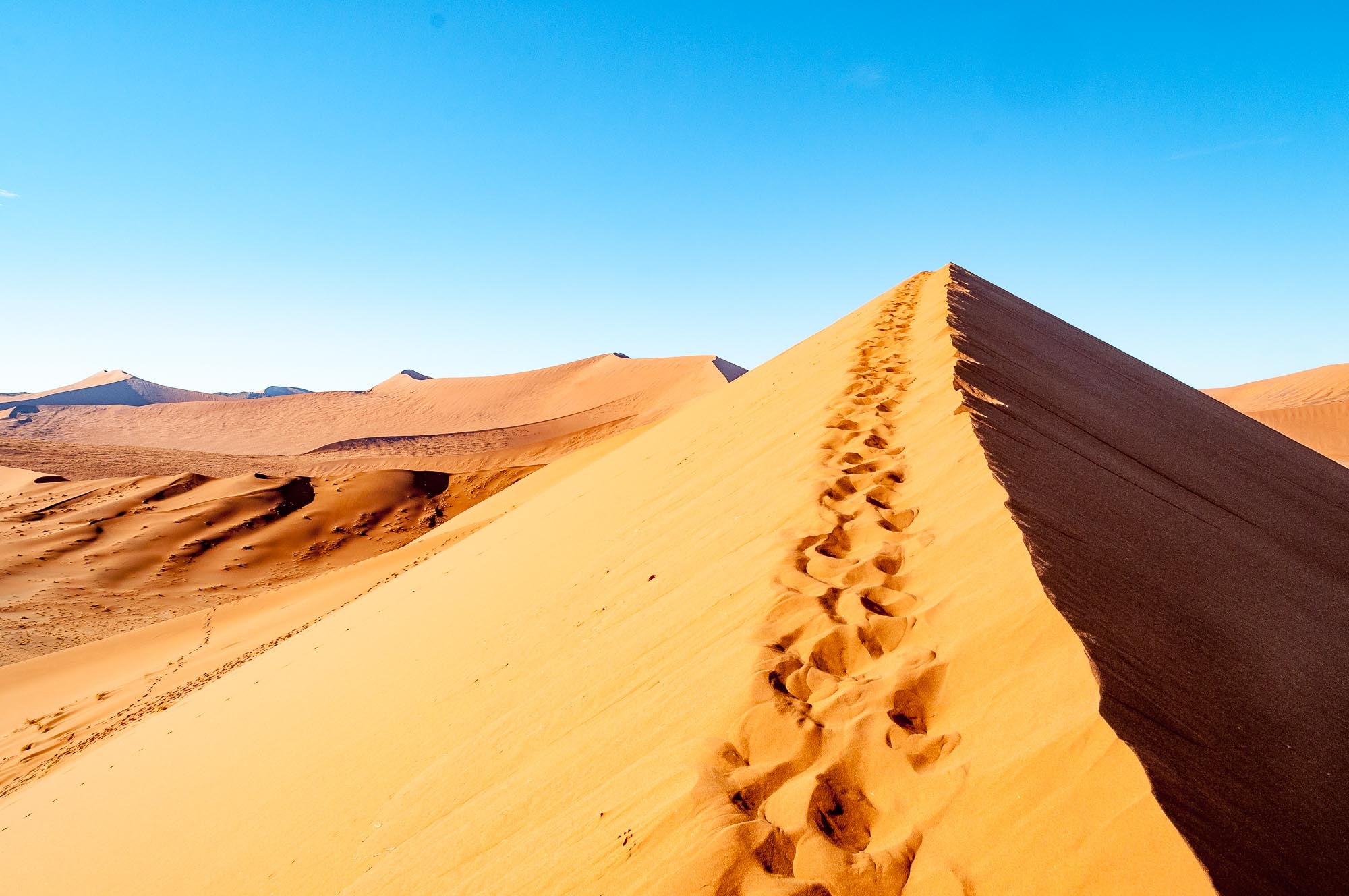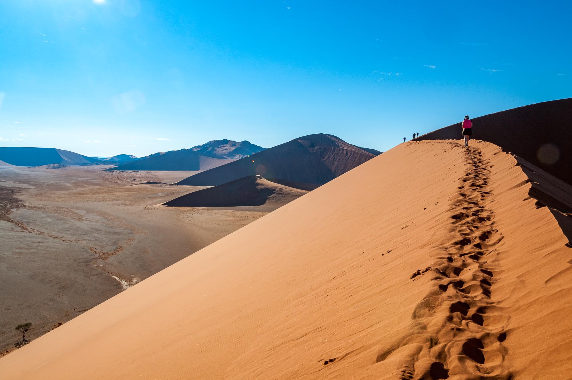 The dune 45 is something special because it belongs e.g. to the few dunes in the Namib that can be climbed. There is a good reason why the ascents are regulated, because footprints on the magnificent dune ridges take a long time to be leveled by wind and weather. A terrible thought, imagine the attached photos littered with traces ...