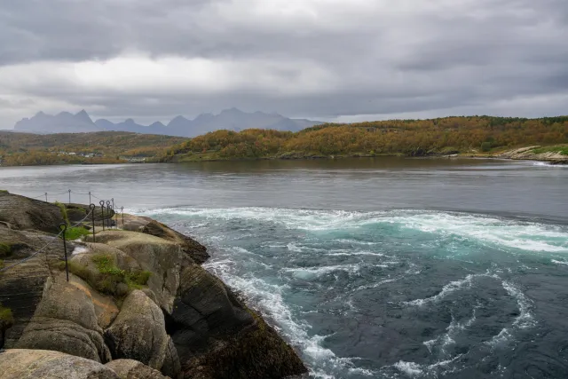 Near the Norwegian town of Bodø you can see one of Norway's most spectacular natural spectacles: Saltstraumen, the strongest tidal current in the world between Saltenfjord and Skjerstadfjord. Through the 3 km long but only 150 meter wide sund, the tides push around 400 million cubic meters of water within the six hour tide - sometimes back and forth. The water masses reach speeds of almost 40 km/h - twice as fast as a top marathon runner. In between, the river lies still, almost like a lake, until the tide turns up again.