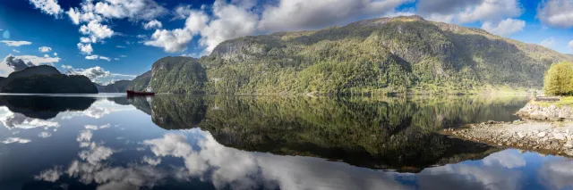 In the quiet fjord foothills near Aurdal in Norway, the fantastic reflection of the white clouds in the blue sky highlighted the motif, a red ship, particularly beautifully.