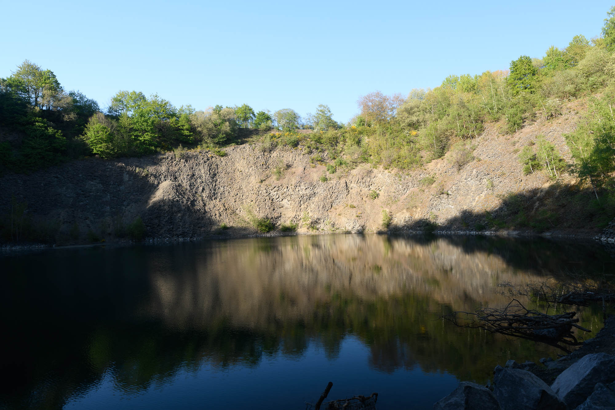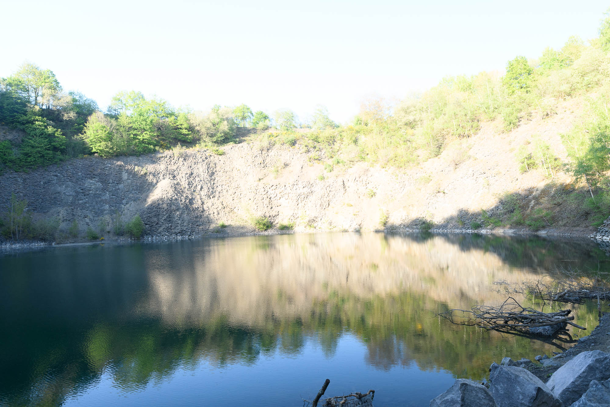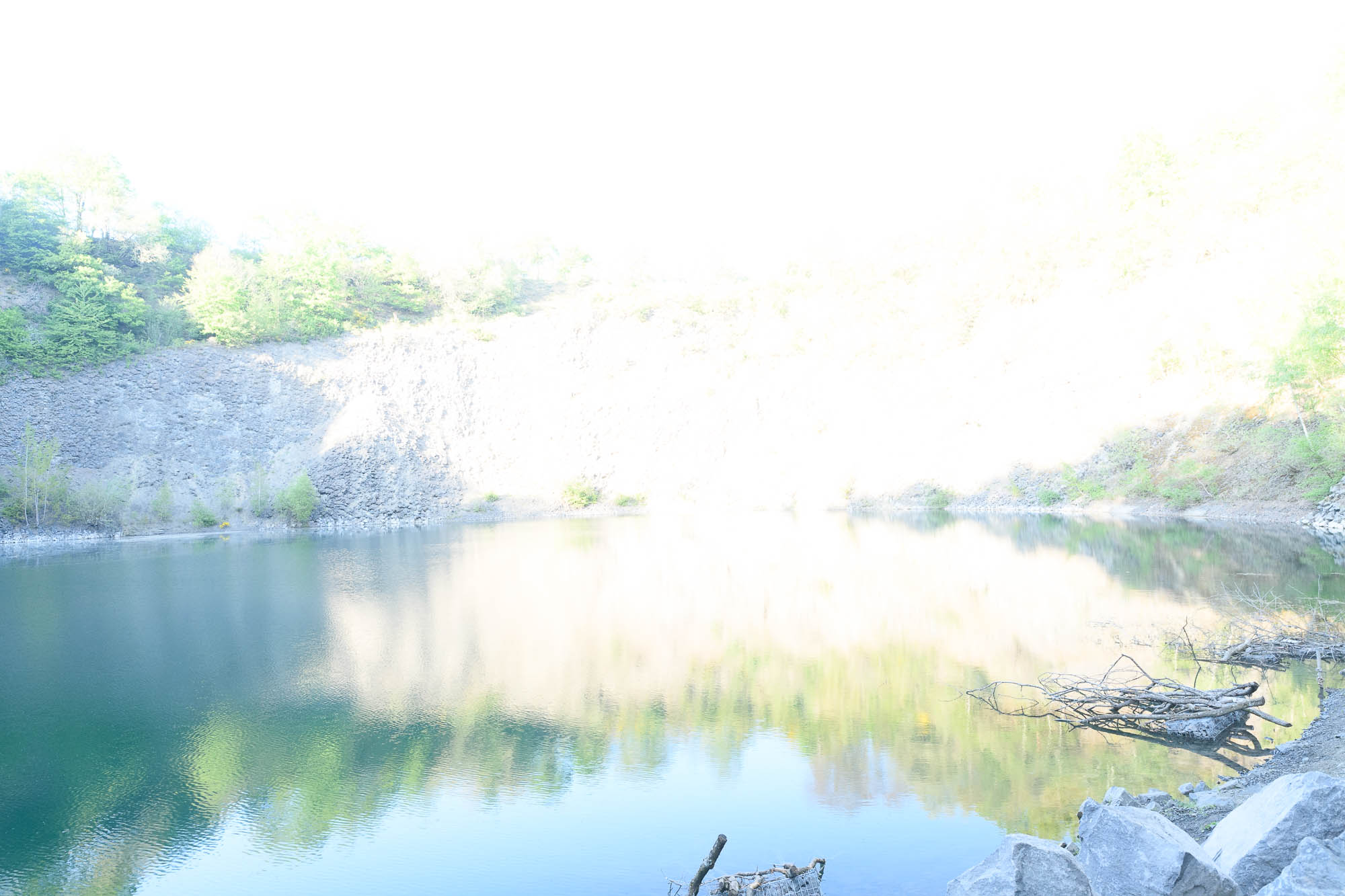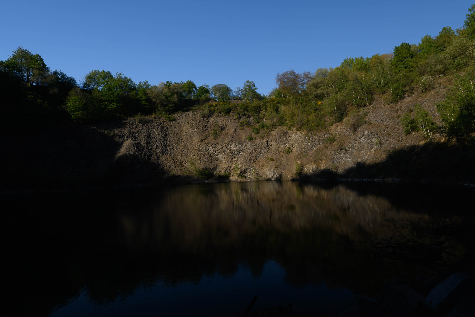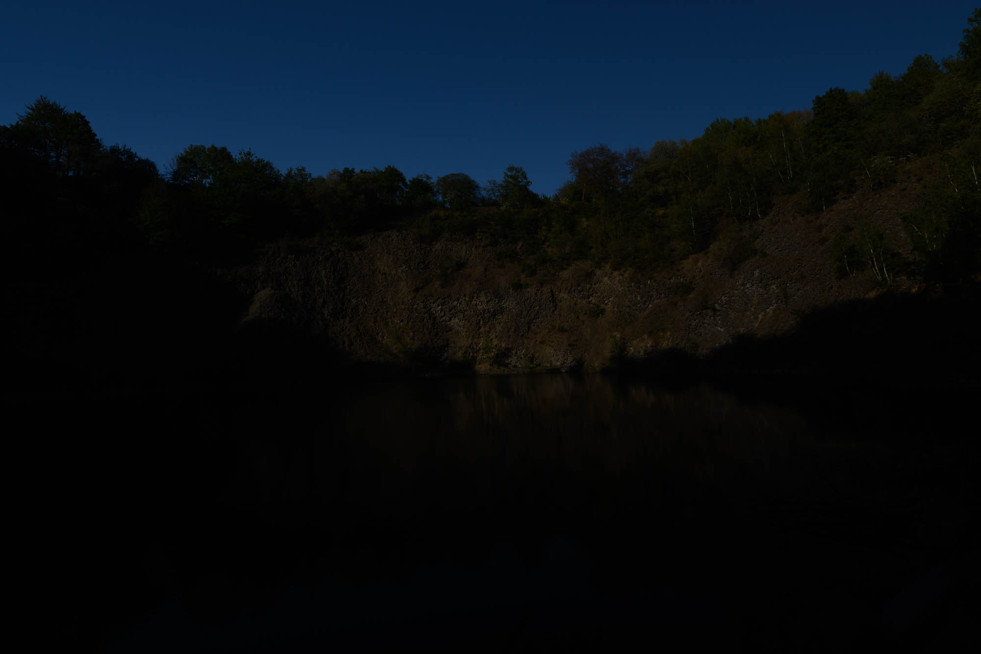 Die HDR-Darstellungstechnik ist in erster Linie dazu gedacht, die eingeschränkten Dynamikumfänge digitaler Sensoren zu kompensieren. Haben Motive sehr helle und gleichzeitig sehr dunkle Bereiche, so verschwinden bei einer einzigen Aufnahme die Details in den (überbelichteten) hellen sowie (unterbelichteten) dunklen Bereichen. Man denke an das mit Tageslicht durchflutete Fenster, das - richtig belichtet - die umgebenden Objekte im Dunkel verschwinden läßt. Bei der HDR-Technik werden nun mehrere Aufnahmen eines Motivs mit unterschiedlichen Belichtungswerten aufgenommen und anschließend per Software so miteinander verrechnet, dass in allen Bereichen die Strukturen erhalten bleiben. Eine typische Belichtungssequenz mit fünf Aufnahmen würde dann mit den Variationen des Belichtungswertes -4, -2, 0, +2, +4 umfassen. Dabei wird lediglich die Verschlusszeit variiert. Die Blende wird konstant gehalten. Die Beispielaufnahmen des Basaltsees in Eulenberg wurden mit Blende f /8.0 und folgenden Belichtungszeiten erstellt: