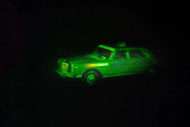 Bild 1: Weißlicht-Hologramm eines Modellautos unter verschiedenen Betrachtungswinkeln