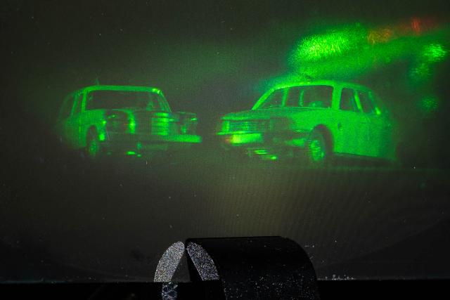 Die Aufnahmen zu diesem Beitrag zeigen aktuelle Fotografien eines Weißlichthologramms in verschiedenen Winkeln zur Betrachtungsachse, das ich 1979 an der Ruhruniversität Bochum erstellt habe. Diese echte dreidimensionale Aufnahme eines kleinen Automodells kann so von mehreren Seiten betrachtet werden.