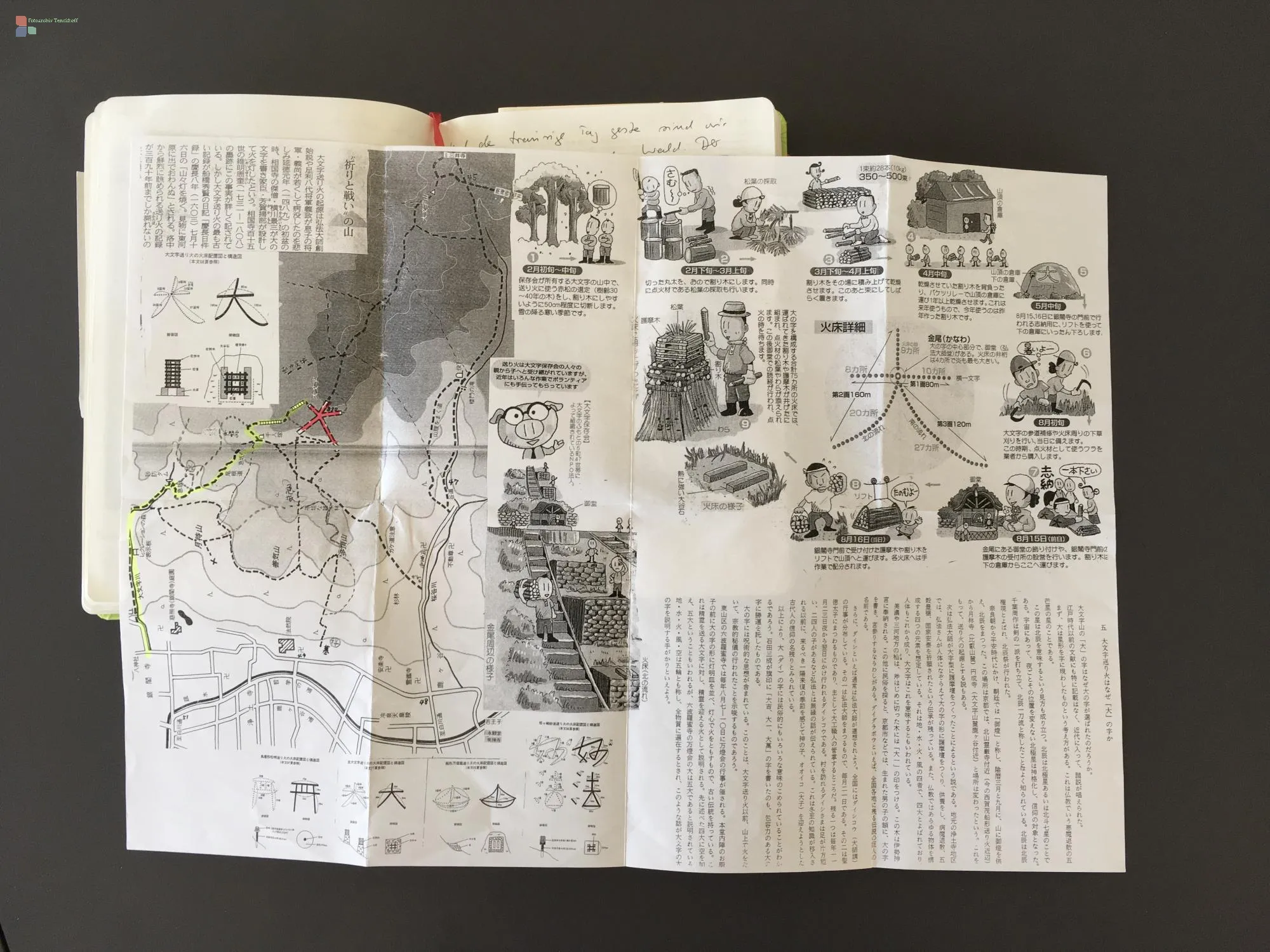 Aus meinem Lieblingsreiseland kommen sogar drei Beispiele. In Kyoto machten wir eine Geocaching Tour durch den Wald. Es gab immer wieder schöne Ausblicke auf die Stadt. Ein japanischer Wanderer hielt uns einen Vortrag über irgendwas, was wir nicht verstanden, und schenkte uns eine Karte mit Anweisungen, wie man ein Feuer macht. Erst im Hotel, wo ich mir in aller Ruhe das Blatt anschaute, um zu entscheiden, ob ich es sofort oder erst später entsorgen würde, verstand ich, worum es ging. Rund um Kyoto sieht man an den Berghängen große Schriftzeichen auf gerodeten Flächen. Im August werden - wie auf dem Blatt beschrieben - Holzstapel in Form der Schriftzeichen entzündet und von der Stadt aus kann man dann die brennenden Schriftzeichen sehen. Am besten gefiel es mir, dass obwohl ich kein Japanisch lesen kann, alles verstehen konnte. Die Feuerzeichen sieht man beim Gozan no Okuribi Fest im August jeden Jahres in Kyoto.