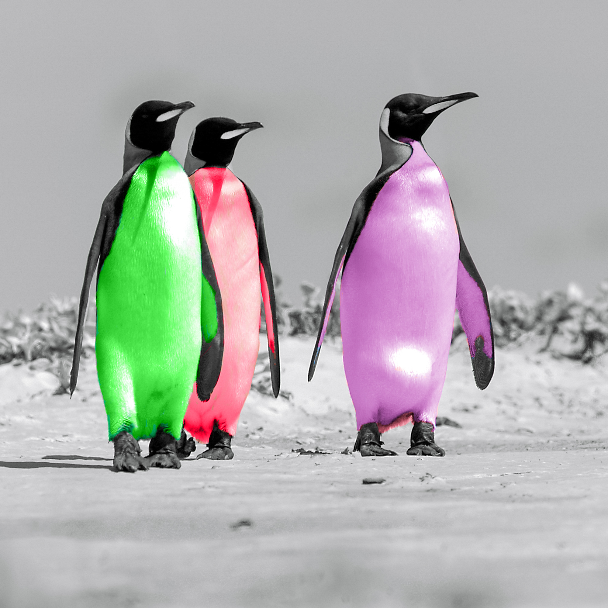 Für diesen Beitrag habe ich 9 digitale Bilder produziert, deren Grundlage ein digitales Foto von drei Königspinguinen bildet, das ich auf den Falklandinseln aufgenommen habe. Die drei Pinguine kamen ins Photoshop-Labor und verließen es neunmal in verschiedenen Farbkombinationen.