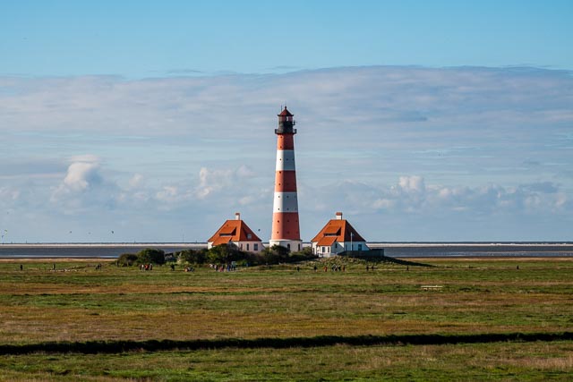 Der Strand zwischen Dünenlandschaft und Meer bei St. Peter-Ording scheint nicht aufhören zu wollen. Diese enorme Fläche wird zu vielen Aktivitäten genutzt und bei guten Wetterbedingungen zeigen die Kitesurfer ihr Können. Richtet man den Blick vom Strand aus nach Norden, so erscheint als kleiner roter Punkt am Horizont - wieder der bekannte Westerhever Leuchtturm.