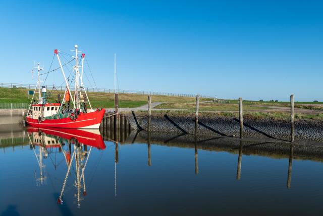 Idyllisch ist der Süderhafen auf Nordstrand, der Halbinsel bei Husum. Ein rotes Fischerboot liegt auf dem Wasser aber die Segeljollen liegen auf dem schwarzen Schlick. Es ist Ebbe und bei der guten Sicht sieht man gegenüber das Ufer von Eiderstedt. Hier drehen sich die Windmühlen des Energieparks.