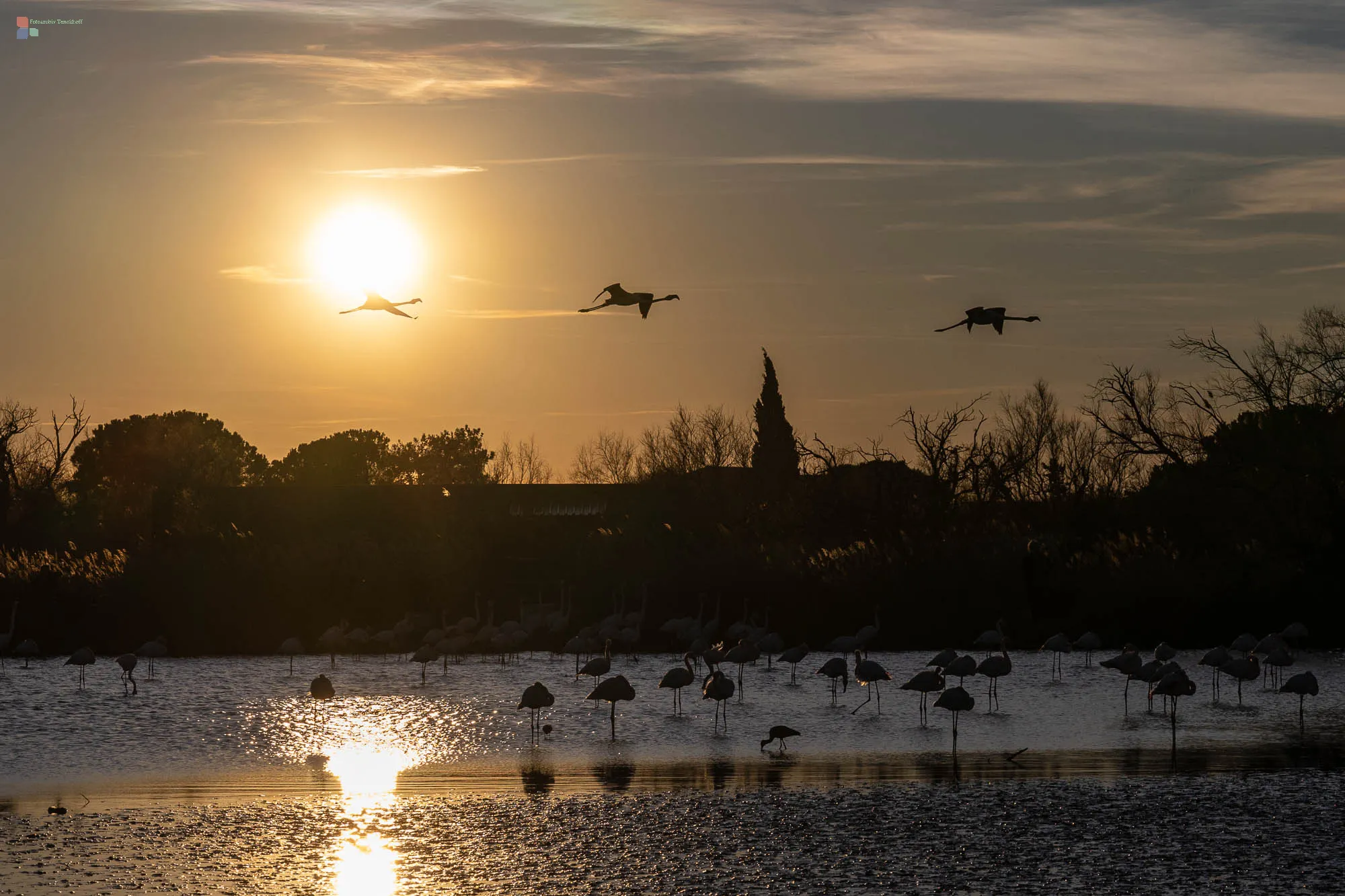 Wir haben die Vögel auch im Parc Ornithologique nördlich von Saintes-Maries-de-la-Mer gesehen, wo sie frei lebend heimisch geworden sind. Bei Windstille zeigen sich beeindruckende Spiegelungen der Vögel im Wasser und beim nahenden Sonnenuntergang sieht man sie an der Sonne vorbei fliegen.