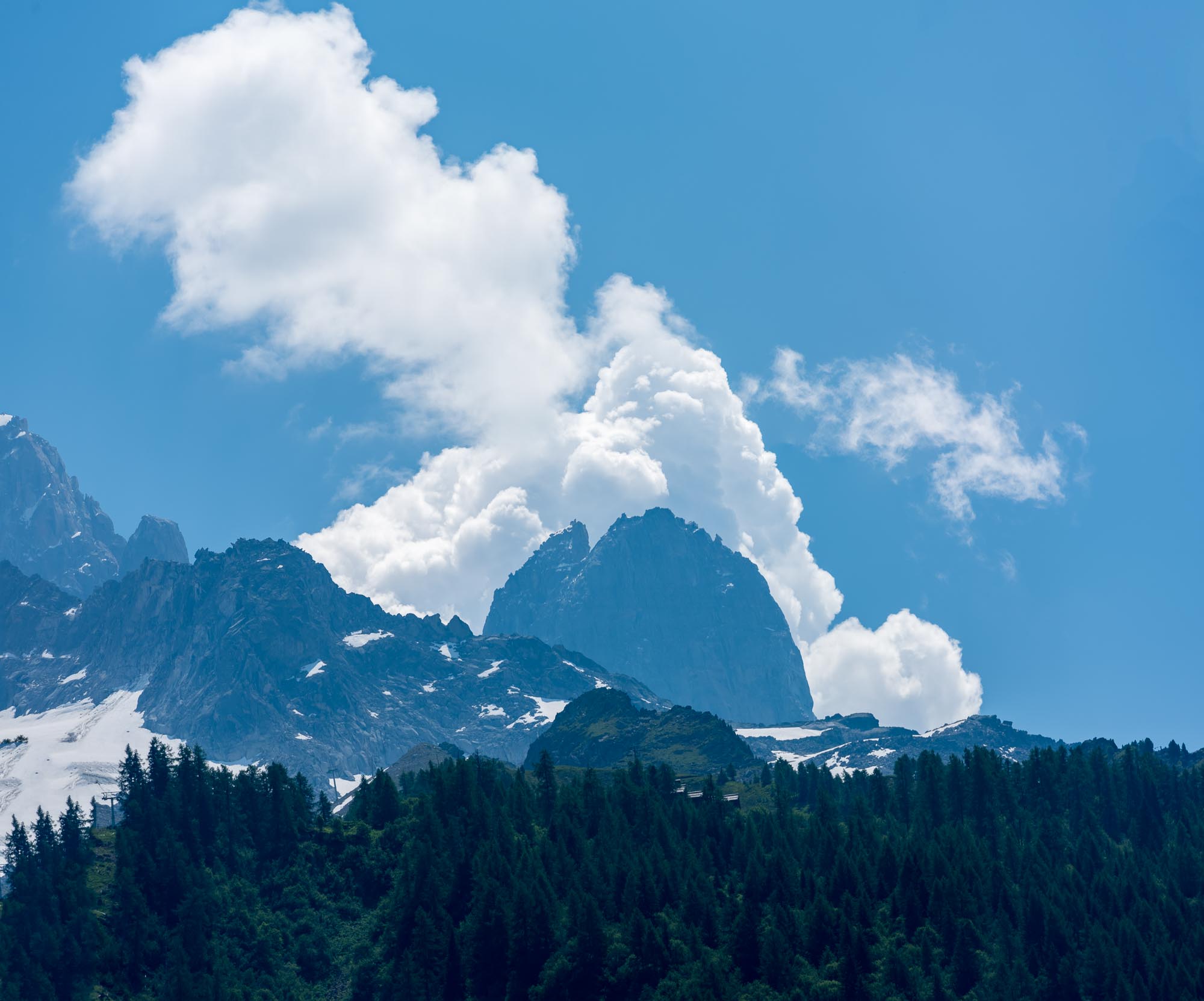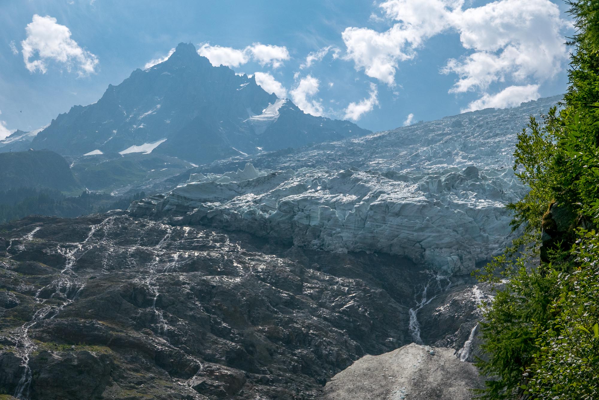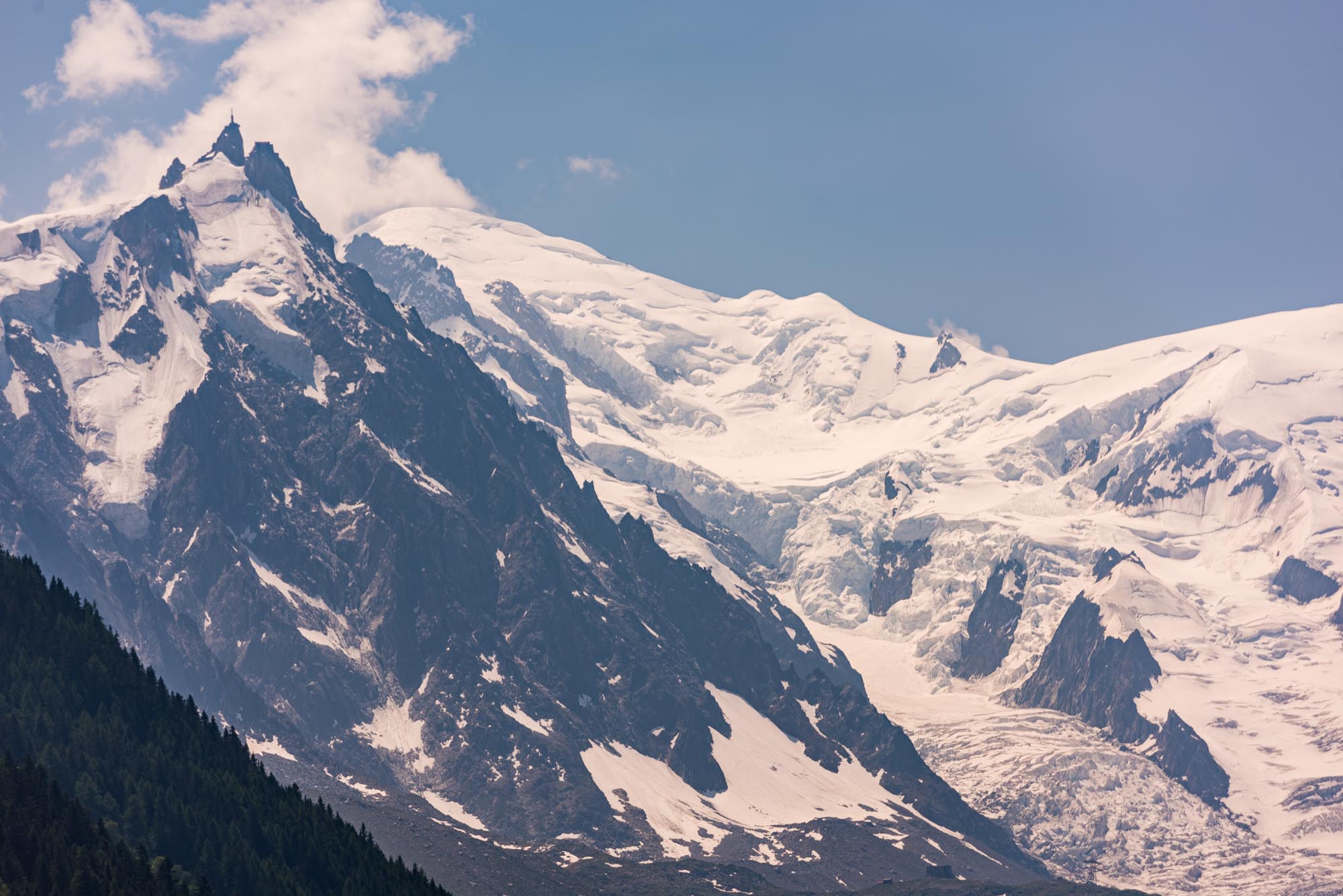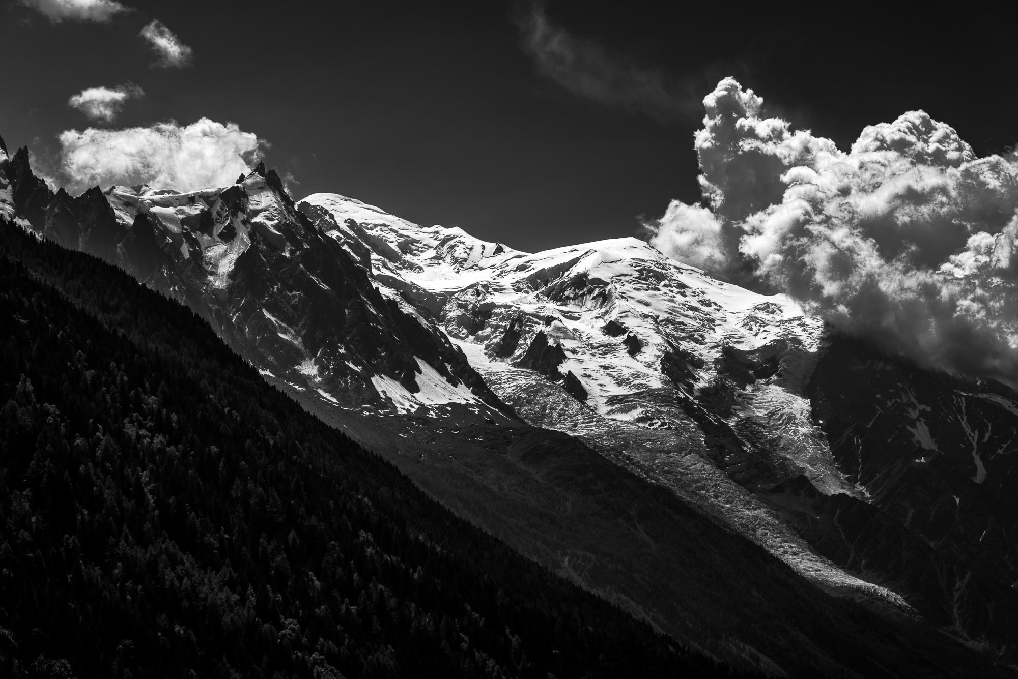Wir waren zur Teilnahme am Mont-Blanc-Marathon angereist und hatten Quartier in D'Argentiere bezogen. Dieser kleine Ort liegt talaufwärts vom Hauptort Chamonix am Mont-Blanc-Massiv und ist nachts sehr ruhig. Von hier aus kann man verschiedene Wanderungen bis zum Mont-Blanc-Massiv oder auf die andere Talseite starten. Fotomotive gibt es reichlich und die wechselhaften Wetter- und Lichtbedingungen bieten immer wieder neue Erscheinungen derselben Gebirgsformationen. In den gezeigten Aufnahmen haben wir HDR-Aufnahmen und Aufnahmen in Infrarottechnik beigefügt, die mit ihren hohen Kontrasten zu beeindruckenden Darstellungen des Mont-Blanc-Massivs beitragen.
