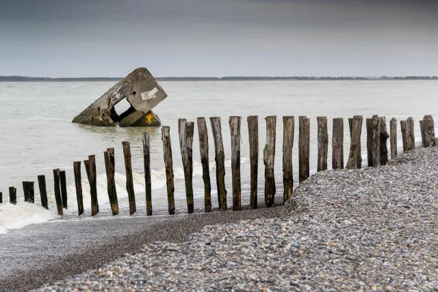 Die Zeit und die Gezeiten haben ihm zugesetzt, und doch bleibt er als stummer Zeuge der Vergangenheit bestehen. Sein Anblick ist beeindruckend – eine Mischung aus Vergänglichkeit und Widerstandskraft. Er erinnert an die bewegte Geschichte dieser Küste und an die unaufhaltsame Kraft der Natur, die selbst massive Betonstrukturen in die Landschaft integriert oder sie langsam verschlingt.