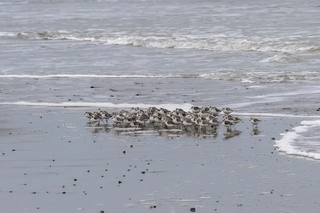 Am Strand entdeckte ich eine Gruppe Sanderlinge (Calidris alba), die geschickt zwischen den Wellen hin und her huschten. Ihre schnellen Bewegungen wirkten fast geisterhaft auf dem nassen Sand. Sie sind faszinierende kleine Watvögel, die auf ihren weiten Zugrouten tausende Kilometer zurücklegen und hier an der Somme-Bucht Nahrung suchen.